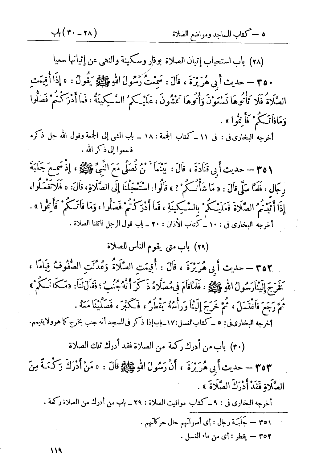 351 - حديث أَبِي قَتَادَةَ، قَالَ: بَيْنَمَا نَحْنُ نُصَلِّي مَعَ النَّبِيِّ صَلَّى اللَّهُ عَلَيْهِ وَسَلَّمَ، إِذْ سَمِعَ جَلَبَةَ رِجَالٍ، فَلَمَّا صَلَّى قَالَ: مَا شَأْنُكُمْ قَالُوا: اسْتَعْجَلْنَا إِلَى الصَّلاَةِ، قَالَ: فَلاَ تَفْعَلُوا، إِذَا أَتَيْتُمُ الصَّلاَةَ فَعَلَيْكُمْ بِالسَّكِينَةِ، فَمَا أَدْرَكْتُمْ فَصَلُّوا، وَمَا فَاتَكُمْ فَأَتِمُّوا