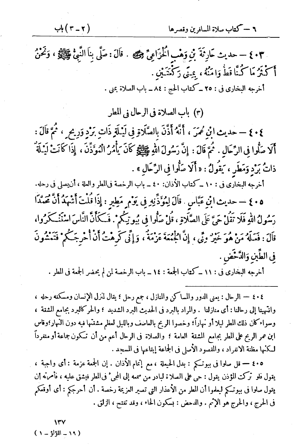 405 - حديث ابْنِ عَبَّاسٍ قَالَ لِمُؤَذِّنِهِ فِي يَوْمٍ مَطِيرٍ: إِذَا قُلْتَ أَشْهَدُ أَنَّ مُحَمَّدًا رَسُولُ اللهِ فَلاَ تَقُلْ حَيَّ عَلَى الصَّلاَةِ، قُلْ صَلُّوا فِي بُيوتِكُمْ فَكَأَنَّ النَّاسَ اسْتَنْكَرُوا، قَالَ: فَعَلَهُ مَنْ هُوَ خَيْرٌ مِنِّي، إِنَّ الْجُمُعَةَ عَزْمَةٌ، وَإِنِّي كَرِهْتُ أَنْ أُحْرِجَكُمْ فَتَمْشُونَ فِي الطِّينِ وَالدَّحْضِ