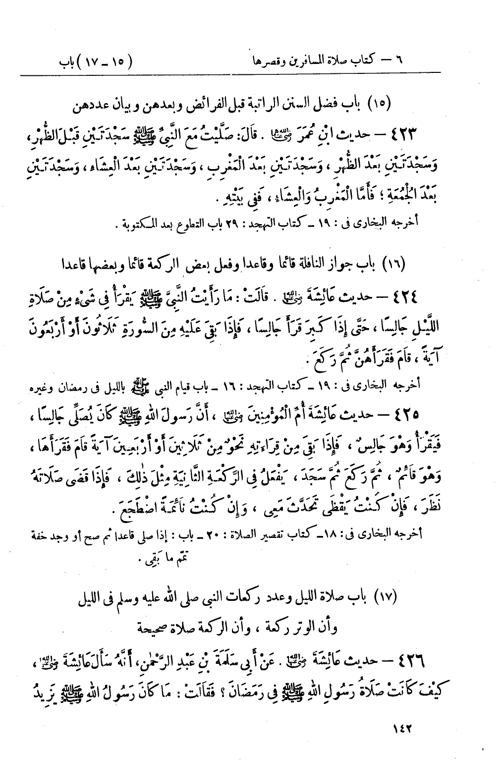 426 - حديث عَائِشَةَ عَنْ أَبِي سَلَمَةَ بْنِ عَبْدِ الرَّحْمنِ، أَنَّهُ سَأَلَ عَائِشَةَ، كيْفَ كَانَتْ صَلاَةُ رَسُولِ اللهِ صَلَّى اللَّهُ عَلَيْهِ وَسَلَّمَ فِي رَمَضَانَ فَقَالَتْ: مَا كَانَ رَسُولُ اللهِ صَلَّى اللَّهُ عَلَيْهِ وَسَلَّمَ يَزِيدُ -[143]- فِي رَمَضَانَ وَلاَ فِي غَيْرِهِ عَلَى إِحْدَى عَشْرَةَ رَكْعَةً، يُصَلِّي أَرْبَعًا فَلاَ تَسَلْ عَنْ حُسْنِهِنَّ وَطُولِهِنَّ، ثُمَّ يُصَلِّي أَرْبَعًا فَلاَ تَسَلْ عَنْ حُسْنِهِنَّ وَطُولِهِنَّ، ثُمَّ يُصَلِّي ثَلاَثًا قَالَتْ عَائِشَةُ: فَقُلْتُ يَا رَسُولَ اللهِ أَتَنَامُ قَبْلَ أَنْ تُوتِرَ فَقَالَ: يَا عَائِشَةُ إِنَّ عَيْنَيَّ تَنَامَانِ وَلاَ يَنَامُ قَلْبِي