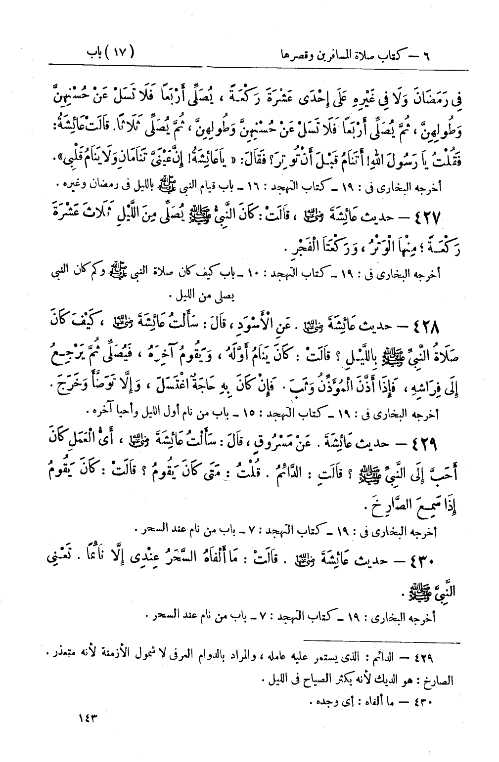 427 - حديث عَائِشَةَ، قَالَتْ: كَانَ النَّبِيُّ صَلَّى اللَّهُ عَلَيْهِ وَسَلَّمَ يُصَلِّي مِنَ اللَّيْلِ ثَلاَثَ عَشْرَةَ رَكْعَةً؛ مِنْهَا الْوِتْرُ، وَرَكْعَتَا الْفَجْرِ