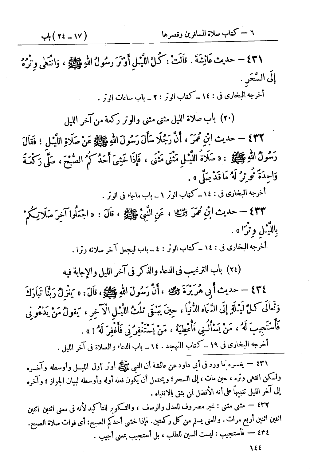 433 - حديث ابْنِ عُمَرَ، عَنِ النَّبِيِّ صَلَّى اللَّهُ عَلَيْهِ وَسَلَّمَ، قَالَ: اجْعَلُوا آخِرَ صَلاَتِكُمْ بِاللَّيْلِ وِتْرًا