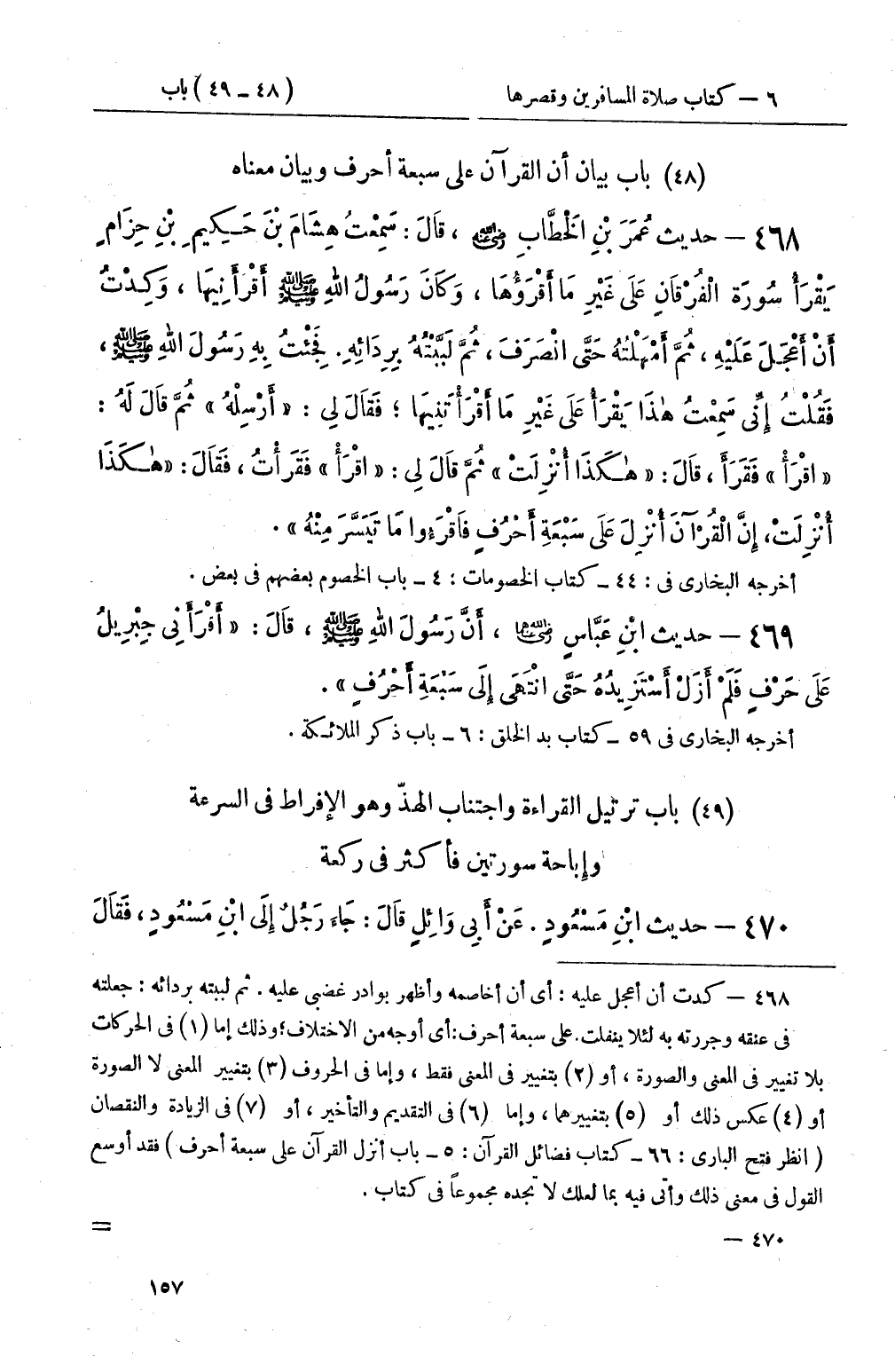 468 - حديث عُمَرَ بْنِ الْخَطَّابِ رضي الله عنه، قَالَ: سَمِعْتُ هِشَامَ بْنَ حَكِيمِ بْنِ حِزَامٍ يَقْرَأُ سُورَة الْفُرْقَانِ عَلَى غَيْرِ مَا أَقْرَؤهَا، وَكَانَ رَسُولُ اللهِ صَلَّى اللَّهُ عَلَيْهِ وَسَلَّمَ أَقْرَأَنِيهَا، وَكِدْتُ أَنْ أَعْجَلَ عَلَيْهِ، ثُمَّ أَمْهَلْتُهُ حَتَّى انْصَرَفَ، ثُمَّ لَبَّبْتُهُ بِرِدَائِهِ فَجِئْتُ بِهِ رَسُولَ اللهِ صَلَّى اللَّهُ عَلَيْهِ وَسَلَّمَ، فَقُلْتُ إِنِّي سَمِعْتُ هذَا يَقْرَأُ عَلَى غَيْرِ مَا أَقْرَأْتَنِيهَا؛ فَقَالَ لِي: أَرْسِلْهُ ثُمَّ قَالَ لَهُ: اقْرَأْ فَقَرَأَ، قَالَ: هكَذَا أُنْزِلَتْ ثُمَّ قَالَ لِي: اقْرَأْ فَقَرَأْتُ، فَقَالَ: هكَذَا أُنْزِلَتْ، إِنَّ الْقُرْآنَ أُنْزِلَ عَلَى سَبْعَةِ أَحْرُفِ فَاقْرَءُوا مَا تَيَسَّرَ مِنْهُ