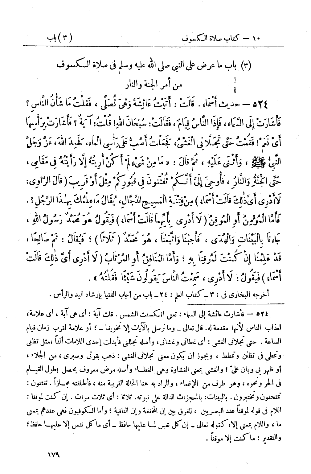 524 - حديث أَسْمَاءَ قَالَتْ: أَتَيْتُ عَائِشَةَ وَهِيَ تُصَلِّي، فَقُلْتُ مَا شَأْنُ النَّاسِ فَأَشَارَتْ إِلَى السَّمَاءِ، فَإِذَا النَّاسُ قِيَامٌ، فَقَالَتْ: سُبْحَانَ اللهِ قُلْتُ: آيَةٌ فَأَشَارَتْ بِرَأْسِهَا أَيْ نَعَمْ فَقُمْتُ حَتَّى تَجَلاَّنِي الْغَشْيُ، فَجَعَلْتُ أَصُبُّ عَلَى رَأْسِي الْمَاءَ، فَحَمِدَ اللهَ، عَزَّ وَجَلَّ النَّبِيُّ صَلَّى اللَّهُ عَلَيْهِ وَسَلَّمَ، وَأَثْنَى عَلَيْهِ، ثُمَّ قَالَ: مَا مِنْ شَيْءٍ لَمْ أَكُنْ أُرِيتُهُ إِلاَّ رَأَيْتُهُ فِي مَقَامِي، حَتَّى الْجَنَّةُ وَالنَّارُ، فَأُوحِيَ إِلَيَّ أَنَّكُمْ تُفْتَنونَ فِي قُبُورِكُمْ مِثْلَ أَوْ قَرِيبَ (قَالَ الرَّاوِي: لاَ أَدْرِي أَيَّ ذلِكَ قَالَتْ أَسْمَاءُ) مِنْ فِتْنَةِ الْمَسِيحِ الدَّجَّالِ، يُقَالُ مَا عِلْمُكَ بِهذَا الرَّجُلِ فَأَمَّا الْمُؤْمِنُ أَوِ الْمُوقِنُ (لاَ أَدْرِي بِأَيِّهِمَا قَالَتْ أَسْمَاءُ) فَيَقُولُ هُوَ مُحَمَّدٌ رَسُولُ اللهِ، جَاءَنَا بِالْبَيِّنَاتِ وَالْهُدَى، فَأَجَبْنَا وَاتَّبَعْنَا، هُوَ مُحَمَّدٌ (ثَلاَثًا) ؛ فَيُقَالُ: نَمْ صَالِحًا، قَدْ عَلِمْنَا إِنْ كُنْتَ لَمُوقِنًا بِهِ؛ وَأَمَّا المُنَافِقُ أَوِ المُرْتَابُ (لاَ أَدْرِي أَيَّ ذلِكَ قَالَتْ أَسْمَاءُ) فَيَقُولُ: لاَ أَدْرِي، سَمِعْتُ النَّاسَ يَقُولُونَ شَيْئًا فَقُلْتُهُ