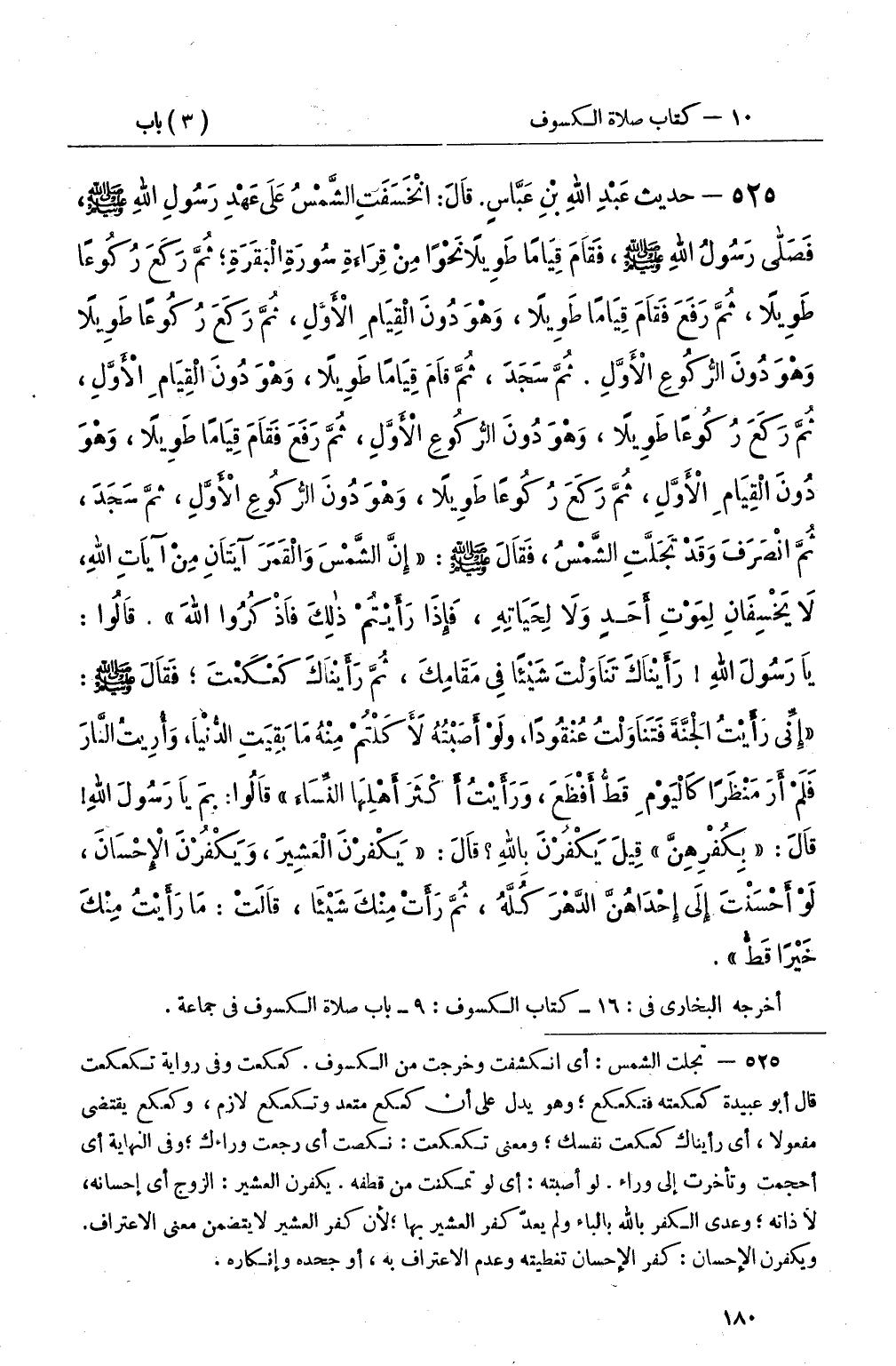 525 - حديث عَبْدِ اللهِ بْنِ عَبَّاسٍ قَالَ: انْخَسَفَتِ الشَّمْسُ عَلَى عَهْدِ رَسُولِ اللهِ صَلَّى اللَّهُ عَلَيْهِ وَسَلَّمَ، فَصَلَّى رَسُولُ اللهِ صَلَّى اللَّهُ عَلَيْهِ وَسَلَّمَ، فَقَامَ قِيَامًا طَوِيلاً نحْوًا مِنْ قِرَاءَةِ سُورَةِ الْبَقَرَةِ؛ ثُمَّ رَكَعَ رُكُوعًا طَويلاً، ثُمَّ رَفَعَ فَقَامَ قِيَامًا طَويلاً، وَهُوَ دُونَ الْقِيَامِ الأَوَّلِ، ثُمَّ رَكَعَ ركوعًا طَويلاً وَهُوَ دُونَ الرُّكوعِ الأَوَّلِ ثُمَّ سَجَدَ، ثُمَّ قَامَ قِيَامًا طَويلاً، وَهُوَ دُونَ الْقِيَامِ الأَوَّلِ، ثُمَّ رَكَعَ رُكُوعًا طَويلاً، وَهُوَ دُونَ الرُّكُوعِ الأَوَّلِ، ثُمَّ رَفَعَ فَقَامَ قِيَامًا طَويِلاً، وَهُوَ دُونَ الْقِيَامِ الأَوَّلِ، ثُمَّ رَكَعَ رُكوعًا طَوِيلاً، وَهُوَ دُونَ الرُّكُوعِ الأَوَّلِ، ثُمَّ سَجَدَ، ثُمَّ انْصَرَفَ وَقَدْ تَجَلَّتِ الشَّمْسُ، فَقَالَ صَلَّى اللَّهُ عَلَيْهِ وَسَلَّمَ: إِنَّ الشَّمْسَ وَالْقَمَرَ آيَتَانِ مِنْ آيَاتِ اللهِ، لاَ يَخْسِفَانِ لِمَوْتِ أَحَدٍ وَلاَ لِحَيَاتِهِ، فَإِذَا رَأَيْتُمْ ذلِكَ فَاذْكُرُوا اللهَ قَالُوا: يَا رَسُولَ اللهِ رَأَيْنَاكَ تَنَاوَلْتَ شَيْئًا فِي مَقَامِكَ، ثُمَّ رَأَيْنَاكَ كَعْكَعْتَ؛ فَقَالَ صَلَّى اللَّهُ عَلَيْهِ وَسَلَّمَ: إِنِّي رَأَيْتُ الْجَنَّةَ فَتَنَاوَلْتُ عُنْقُودًا، وَلَوْ أَصَبْتُهُ لأَكَلْتُمْ مِنْهُ مَا بَقِيَتِ الدُّنْيَا، وَأُرِيتُ النَّارَ فَلَمْ أَرَ مَنْظَرًا كَالْيَوْمِ قَطُّ أَفْظَعَ، وَرَأَيْتُ أَكْثَرَ أَهْلِهَا النِّسَاءَ قَالُوا: بِمَ يَا رَسُولَ اللهِ قَالَ: بِكُفْرِهِنَّ قِيلَ: يَكْفُرْنَ بِاللهِ قَالَ: يَكْفُرْنَ الْعَشِيرَ، وَيَكْفُرْنَ الإِحْسَانَ، لَوْ أَحْسَنْتَ إِلَى إِحْدَاهُنَّ الدَّهْرَ كُلَّهُ، ثُمَّ رَأَتْ مِنْكَ شَيْئًا، قَالَتْ: مَا رَأَيْتُ مِنْكَ خَيْرًا قَطُّ