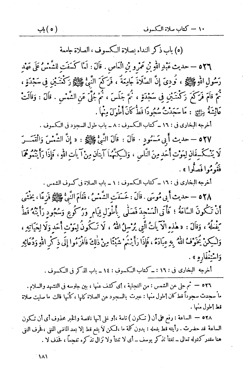 526 - حديث عَبْدِ اللهِ بْنِ عَمْرِو بْنِ الْعَاصِ قَالَ: لَمَّا كَسَفَتِ الشَّمْسُ عَلَى عَهْدِ رَسُولِ اللهِ صَلَّى اللَّهُ عَلَيْهِ وَسَلَّمَ، نُودِيَ: إِنَّ الصَّلاَةَ جَامِعَةٌ، فَرَكَعَ النَّبِيُّ صَلَّى اللَّهُ عَلَيْهِ وَسَلَّمَ رَكْعَتَيْنِ فِي سَجْدَةٍ، ثُمَّ قَامَ فَرَكَعَ رَكْعَتَيْنِ فِي سَجْدَةٍ، ثُمَّ جَلَسَ، ثُمَّ جُلِّيَ عَنِ الشَّمْسِ قَالَ: وَقَالَتْ عَائِشَةُ: مَا سَجَدْتُ سُجُودًا قَطُّ كَانَ أَطْوَلَ مِنْهَا