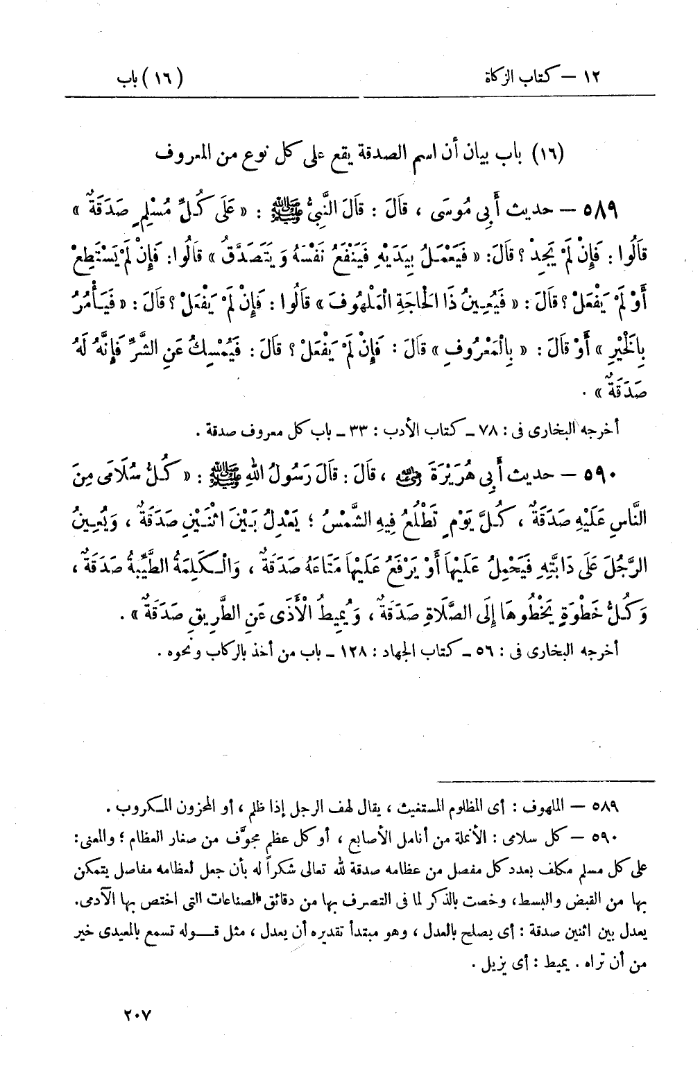 590 - حديث أَبِي هُرَيْرَةَ رضي الله عنه، قَالَ: قَالَ رَسُولُ اللهِ صَلَّى اللَّهُ عَلَيْهِ وَسَلَّمَ: كُلُّ سُلاَمَى مِنَ النَّاسِ عَلَيْهِ صَدَقَةٌ، كُلَّ يَوْمٍ تَطْلُعُ فِيهِ الشَّمْسُ؛ يَعْدِلُ بَيْنَ اثْنَيْنِ صَدَقَةٌ، وَيُعِينُ الرَّجُلَ عَلَى دَابَّتِهِ فَيَحْمِلُ عَلَيْهَا أَو يَرْفَعُ عَلَيْهَا مَتَاعَهُ صَدَقَةٌ، وَالْكَلِمَةُ الطَّيِّبَةُ صَدَقَةٌ وَكُلُّ خَطْوَةٍ يَخْطُوهَا إِلَى الصَّلاَةِ صَدَقَةٌ، وَيُمِيطُ الأَذَى عَنِ الطَّرِيقِ صَدَقَةٌ
