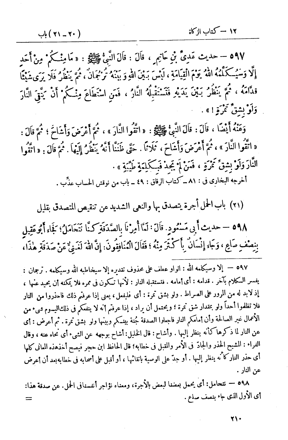 597 - حديث عَدِيِّ بْنِ حَاتِمٍ، قَالَ: قَالَ النَّبِيُّ صَلَّى اللَّهُ عَلَيْهِ وَسَلَّمَ: مَا مِنْكُمْ مِنْ أَحَدٍ إِلاَّ وَسَيُكَلِّمُهُ اللهُ يَوْمَ الْقِيَامَةِ، لَيْسَ بَيْنَ اللهِ وَبَيْنَهُ تَرْجُمَانٌ، ثُمَّ يَنْظُرُ فَلاَ يَرَى شَيْئًا قدَّامَهُ، ثُمَّ يَنْظُرُ بَيْنَ يَدَيْهِ فَتَسْتَقْبِلُهُ النَّارُ، فَمَنِ اسْتَطَاعَ مِنْكُمْ أَنْ يَتَّقِيَ النَّارَ وَلَوْ بِشِقِّ تَمْرَةٍ