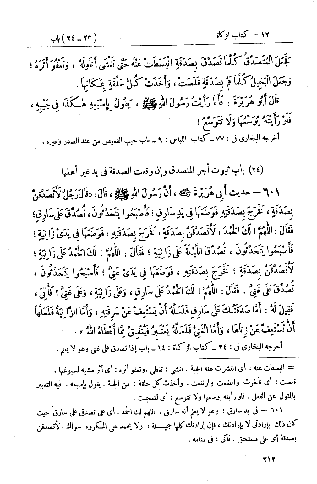 601 - حديث أَبِي هُرَيْرَةَ رضي الله عنه، أَنَّ رَسُولَ اللهِ صَلَّى اللَّهُ عَلَيْهِ وَسَلَّمَ، قَالَ: قَالَ رَجُلٌ لأَتَصَدَّقَنَّ بِصَدَقَةٍ، فَخَرَجَ بِصَدَقَتِهِ فَوَضَعَهَا فِي يَدِ سَارِقٍ؛ فَأَصْبَحُوا يَتَحَدَّثُونَ، تُصُدِّقَ عَلَى سَارِقٍ؛ فَقَالَ: اللهُمَّ لَكَ الْحَمْدُ، لأَتَصَدَّقَنَّ بِصَدَقَةٍ، فَخَرَجَ بِصَدَقَتِهِ، فَوَضَعَهَا فِي يَدَيْ زَانِيَةٍ؛ فَأَصْبَحُوا يَتَحَدَّثُونَ، تُصُدِّقَ اللَّيْلَةَ عَلَى زَانِيَةٍ؛ فَقَالَ: اللهُمَّ لَكَ الْحَمْدُ عَلَى زَانِيَةٍ؛ لأَتَصَدَّقَنَّ بِصَدَقَةٍ؛ فَخَرَجَ بِصَدَقَتِهِ، فَوَضَعَهَا فِي يَدَيْ غَنِيٍّ؛ فَأَصْبَحُوا يَتَحَدَّثُونَ، تُصُدِّقَ عَلَى غَنِيٍّ فَقَالَ: اللهُمَّ لَكَ الْحَمْدُ عَلَى سَارِقٍ، وَعَلَى زَانِيَةٍ، وَعَلَى غَنِيٍّ فَأُتِيَ، فَقِيلَ لَهُ: أَمَّا صَدَقَتُكَ عَلَى سَارِقٍ فَلَعَلَّهُ أَنْ يَسْتَعِفَّ عَنْ سَرِقَتِهِ، وَأَمَّا الزَّانِيَةُ فَلَعَلَّهَا أَنْ تَسْتَعِفَّ عَنْ زِنَاهَا، وَأَمَّا الْغَنِيُّ فَلَعَلَّهُ يَعْتَبِرُ فَيُنْفِقُ مِمَّا أَعْطَاهُ اللهُ