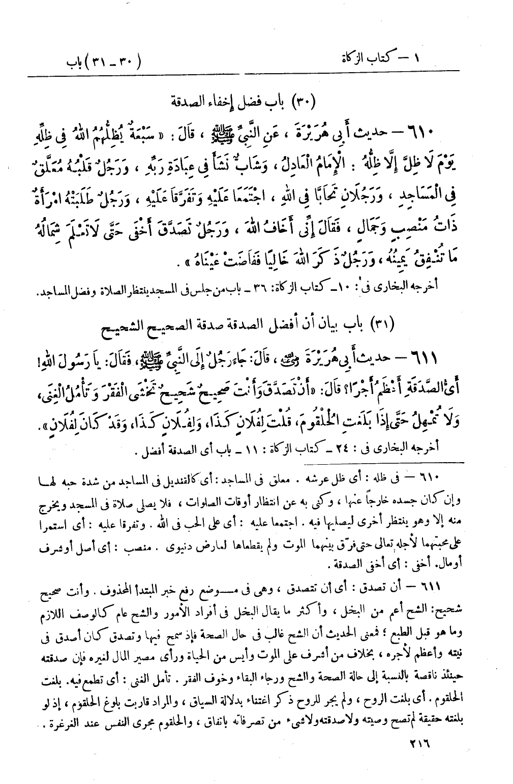 610 - حديث أَبِي هُرَيْرَةَ، عَنِ النَّبِيِّ صَلَّى اللَّهُ عَلَيْهِ وَسَلَّمَ، قَالَ: سَبْعَةٌ يُظِلُّهُمُ اللهُ فِي ظِلِّهِ يَوْمَ لاَ ظِلَّ إِلاَّ ظِلُّهُ: الإِمَامُ الْعَادِلُ، وَشَابٌّ نَشَأَ فِي عِبَادَةِ رَبِّهِ، وَرَجُلٌ قَلْبُهُ مُعَلَّقٌ فِي الْمَسَاجِدِ، وَرَجُلاَنِ تَحَابَّا فِي اللهِ، اجْتَمَعَا عَلَيْهِ وَتَفَرَّقَا عَلَيْهِ، وَرَجُلٌ طَلَبَتْهُ امْرَأَةٌ ذَاتُ مَنْصِبٍ وَجَمَالٍ، فَقَالَ إِنِّي أَخَافُ اللهَ، وَرَجُلٌ تَصَدَّقَ أَخْفَى حَتَّى لاَ تَعْلَمَ شِمَالُهُ مَا تُنْفِقُ يَمِينُهُ، وَرَجُلٌ ذَكَرَ اللهَ خَالِيًا فَفَاضَتْ عَيْنَاهُ