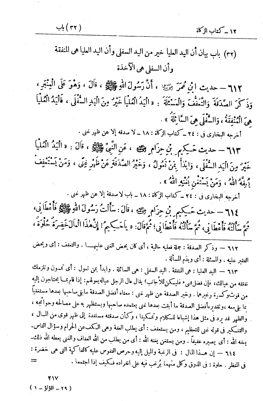 613 - حديث حَكِيمِ بْنِ حِزَامٍ رضي الله عنه، عَنِ النَّبِيِّ صَلَّى اللَّهُ عَلَيْهِ وَسَلَّمَ، قَالَ: الْيَدُ الْعُلْيَا خَيْرٌ مِنَ الْيَدِ السُّفْلَى، وَابْدَأْ بِمَنْ تَعُولُ، وَخَيْرُ الصَّدَقَةِ عَنْ ظَهْرِ غِنًى، وَمَنْ يَسْتَعْفِفْ يُعِفَّهُ اللهُ، وَمَنْ يَسْتَغْنِ يُغْنِهِ اللهُ