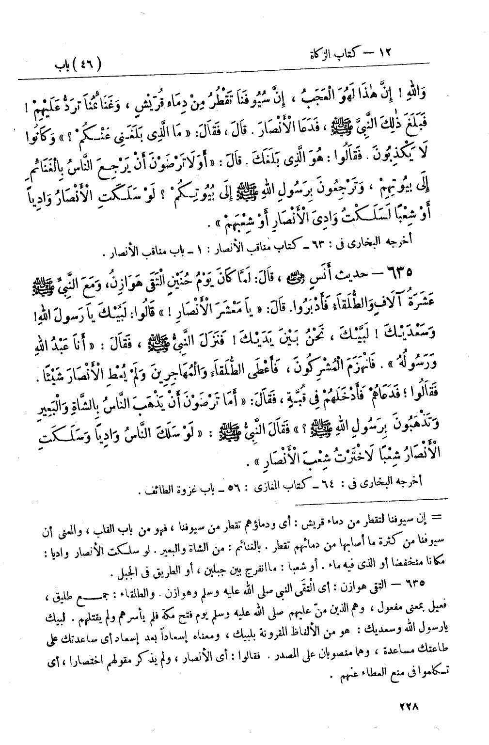 635 - حديث أَنَسٍ رضي الله عنه، قَالَ: لَمَّا كَانَ يَوْمُ حُنَيْنٍ الْتَقَى هَوَازِنُ، وَمَعَ النَّبِيِّ صَلَّى اللَّهُ عَلَيْهِ وَسَلَّمَ عَشَرَةُ آلاَفٍ وَالطُّلَقَاءُ فَأَدْبَرُوا قَالَ: يَا مَعْشَرَ الأَنْصَارِ قَالُوا: لَبَّيْكَ يَا رَسُولَ اللهِ وَسَعْدَيْكَ لَبَّيْكَ، نَحْنُ بَيْنَ يَدَيْكَ فَنَزَلَ النَّبِيُّ صَلَّى اللَّهُ عَلَيْهِ وَسَلَّمَ، فَقَالَ: أَنَا عَبْدُ اللهِ وَرَسُولُهُ فَانْهَزَمَ الْمُشْرِكُونَ، فَأَعْطَى الطُّلَقَاءَ وَالْمُهَاجِرِينَ وَلَمْ يُعْطِ الأَنْصَارَ شَيْئًا فَقَالُوا؛ فَدَعَاهُمْ فَأَدْخَلَهُمْ فِي قُبَّةٍ، فَقَالَ: أَمَا تَرْضَوْنَ أَنْ يَذْهَبَ النَّاسُ بِالشَّاةِ وَالْبَعِيرِ وَتَذْهَبُونَ بِرَسُولِ اللهِ صَلَّى اللَّهُ عَلَيْهِ وَسَلَّمَ فَقَالَ النَّبِيُّ صَلَّى اللَّهُ عَلَيْهِ وَسَلَّمَ: لَوْ سَلَكَ النَّاسُ وَادِيًا وَسَلَكَتِ الأَنْصَارُ شِعْبًا لاَخْتَرْتُ شِعْبَ الأَنْصَارِ