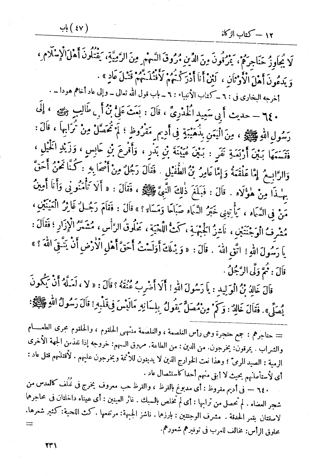 قَالَ خَالِدُ بْنُ الْوَلِيدِ: يَا رَسُولَ اللهِ أَلاَ أَضْرِبُ عُنُقَهُ قَالَ: لا، لَعَلَّهُ أَنْ يَكُونَ يُصَلِّي فَقَالَ خَالِدٌ: وَكَمْ مِنْ مُصَلٍّ يَقُولُ بِلِسَانِهِ مَا لَيْسَ فِي قَلْبِهِ قَالَ رَسُولُ اللهِ صَلَّى اللَّهُ عَلَيْهِ وَسَلَّمَ: -[232]- إِنِّي لَمْ أُومَرْ أَنْ أَنْقُبَ قُلُوبَ النَّاسِ، وَلاَ أَشُقَّ بُطُونَهُمْ قَالَ: ثُمَّ نَظَرَ إِلَيْهِ، وَهُوَ مُقَفٍّ، فَقَالَ: إِنَّهُ يَخْرُجُ مِنْ ضِئْضِئِي هذَا قَوْمٌ يَتْلُونَ كِتَابَ اللهِ رَطْبًا، لاَ يُجَاوِزُ حَنَاجِرَهُمْ، يَمْرُقُونَ مِنَ الدِّينِ كَمَا يَمْرُقُ السَّهْمُ مِنَ الرَّمِيَّةِ وَأَظُنُّهُ قَالَ: لَئِنْ أَدْرَكْتُهُمْ لأَقْتُلَنَّهُمْ قَتْلَ ثَمُودَ