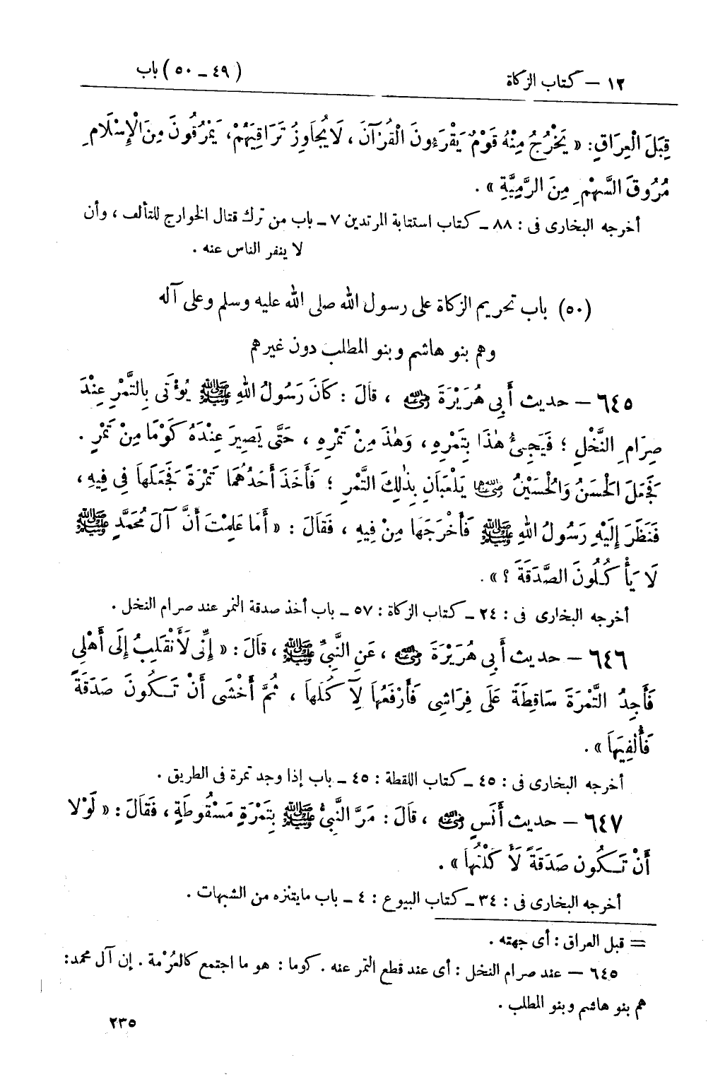645 - حديث أَبِي هُرَيْرَةَ رضي الله عنه، قَالَ: كَانَ رَسُولُ اللهِ صَلَّى اللَّهُ عَلَيْهِ وَسَلَّمَ يُؤْتَى بِالتَّمْرِ عِنْدَ صِرَامِ النَّخْلِ؛ فَيَجِيءُ هذَا بِتَمْرِهِ، وَهذَا مِنْ تَمْرِهِ، حَتَّى يَصِيرَ عِنْدَهُ كَوْمًا مِنْ تَمْرٍ فَجَعَلَ الْحَسَنُ وَالْحُسَيْنُ يَلْعَبَانِ بِذلِكَ التَّمْرِ؛ فَأَخَذَ أَحَدُهُمَا تَمْرَةً فَجَعَلَهَا فِي فِيهِ، فَنَظَرَ إِلَيْهِ رَسُولُ اللهِ صَلَّى اللَّهُ عَلَيْهِ وَسَلَّمَ فَأَخْرَجَهَا مِنْ فِيهِ، فَقَالَ: أَمَا عَلِمْتَ أَنَّ آلَ مُحَمَّدٍ صَلَّى اللَّهُ عَلَيْهِ وَسَلَّمَ لاَ يَأْكُلُونَ الصَّدَقَةَ