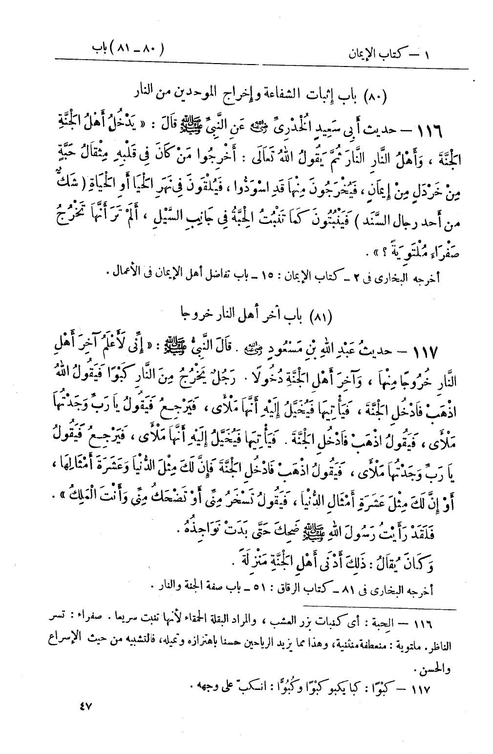 117 - حديثُ عَبْدِ اللهِ بْنِ مَسْعُودٍ رضي الله عنه قَالَ النَّبِيُّ صَلَّى اللَّهُ عَلَيْهِ وَسَلَّمَ: إِنِّي لأَعْلَمُ آخِرَ أَهْلِ النَّارِ خُرُوجًا مِنْهَا، وَآخِرَ أَهْلِ الْجَنَّةِ دُخُولاً رَجُلٌ يَخْرُجُ مِنَ النَّارِ كَبْوًا فَيَقُولُ اللهُ اذْهَبْ فَادْخُلِ الْجَنَّةَ، فَيَأْتِيهَا فَيُخَيَّلُ إِلَيْهِ أَنَّهَا مَلأَى، فَيَرْجِعُ فَيَقُولُ يَا رَبِّ وَجَدْتُهَا مَلأَى، فَيَقُولُ اذْهَب فَادْخُلِ الْجَنَّةَ فَيَأْتِيَها فَيُخَيَّلُ إِلَيْهِ أَنَّهَا مَلأَى، فَيَرْجِعُ فَيَقُولُ يَا رَبِّ وَجَدْتُهَا مَلأَى، فَيَقُولُ اذْهَب فادْخُلِ الْجَنَّةَ فَإِنَّ لَكَ مِثْلَ الدُّنْيَا وَعَشَرَةَ أَمْثَالِهَا، أَوْ إِنَّ لَكَ مِثْلَ عَشَرَةِ أَمْثَالِ الدُّنْيَا، فَيَقُولُ تَسخَرُ مِنِّي أَوْ تَضْحَكُ مِنِّي وَأَنْتَ الْمَلِكُ