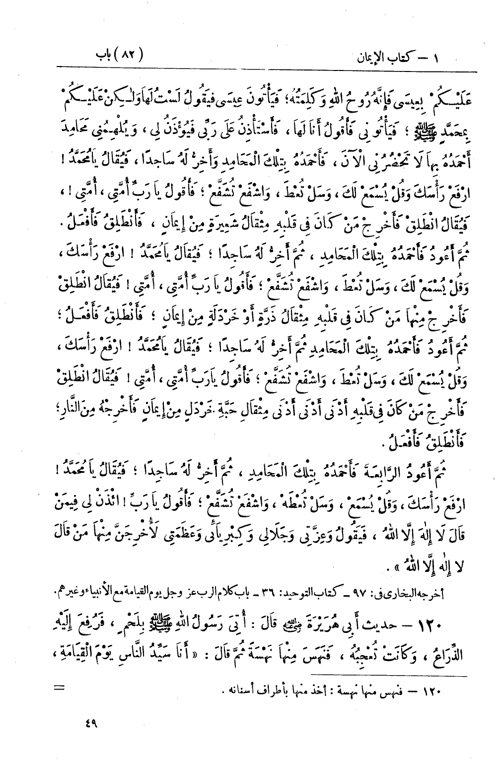 120 - حديث أَبِي هُرَيْرَةَ رضي الله عنه قَالَ: أُتِيَ رَسُولُ اللهِ صَلَّى اللَّهُ عَلَيْهِ وَسَلَّمَ بِلَحْمٍ، فَرُفِعَ إِلَيْهِ الذِّرَاعُ، وَكَانَتْ تُعْجِبُهُ، فَنَهَسَ مِنْهَا نَهْسَةً ثُمَّ قَالَ: أَنَا سَيِّدُ النَّاسِ يَوْمَ الْقِيَامَةِ، -[50]- وَهَلْ تَدْرُونَ مِمَّ ذَلِكَ يُجْمَعُ النَّاسُ الأَوَّلِينَ وَالآخِرِينَ فِي صَعِيدٍ وِاحِدٍ، يُسْمِعُهُمُ الدَّاعِي، وَيَنْفُذُهُمُ الْبَصَرُ، وَتَدْنُو الشَّمْسُ فَيَبْلُغُ النَّاسَ مِنَ الغَمِّ وَالْكَرْبِ مَا لاَ يُطِيقُونَ وَلاَ يَحْتَمِلُونَ؛ فَيَقُولُ النَّاسُ أَلاَ تَرَوْنَ مَا قَدْ بَلَغَكُمْ أَلاَ تَنْظُرُونَ مَنْ يَشْفَعُ لَكُمْ إِلَى رَبِّكُمْ فَيقُولُ بَعْضُ النَّاسِ لِبَعْضٍ، عَلَيْكُمْ بِآدَمَ، فَيَأْتُونَ آدَمَ عَلَيْهِ السَّلاَمُ؛ فَيَقُولُونَ لَهُ: أَنْتَ أَبُو الْبَشَر، خَلَقَكَ اللهُ بِيَدِهِ، وَنَفَخَ فِيكَ مِنْ رُوحِهِ، وَأَمَرَ الْمَلاَئِكَةَ فَسَجَدُوا لَكَ، اشْفَعْ لَنَا إِلَى رَبِّكَ، أَلاَ تَرَى إِلَى مَا نَحْنُ فِيهِ أَلاَ تَرَى إِلَى مَا قَدْ بَلَغَنَا فَيَقُولُ آدَمُ إِنَّ رَبِّي قَدْ غَضِبَ الْيَوْمَ غَضَبًا لَمْ يَغْضَبْ قَبْلَهُ مِثْلَهُ وَلَنْ يَغْضَبَ بَعْدَهُ مِثْلَهُ، وَإِنَّهُ نَهَانِي عَنِ الشَّجَرَةِ فَعَصَيْتُهُ، نَفْسِي نَفْسِي نَفْسِي؛ اذْهَبُوا إِلَى غَيْرِي، اذْهَبُوا إِلَى نُوحٍ؛ فَيَأْتُونَ نُوحًا فَيَقُولُونَ: يَا نُوحُ إِنَّكَ أَنْتَ أَوَّلُ الرُّسُلِ إِلَى أَهْلِ الأَرْضِ، وَقَدْ سَمَّاكَ اللهُ عَبْدًا شَكُورًا، اشْفَعْ لَنَا إِلَى رَبِّكَ، أَلاَ تَرَى إِلَى مَا نَحْنُ فِيهِ فَيَقُولُ: إِنَّ رَبِّي عَزَّ وَجَلَّ قَدْ غَضِبَ الْيَوْمَ غَضَبًا لَمْ يَغْضَبْ قَبْلَهُ مِثْلَهُ وَلَنْ يَغْضَبَ بَعْدَهُ مِثْلَهُ؛ وَإِنَّهُ قَدْ كَانَتْ لِي دَعْوَةٌ دَعَوْتُهَا عَلَى قَوْمِي، نَفْسِي نَفْسِي نَفْسِي