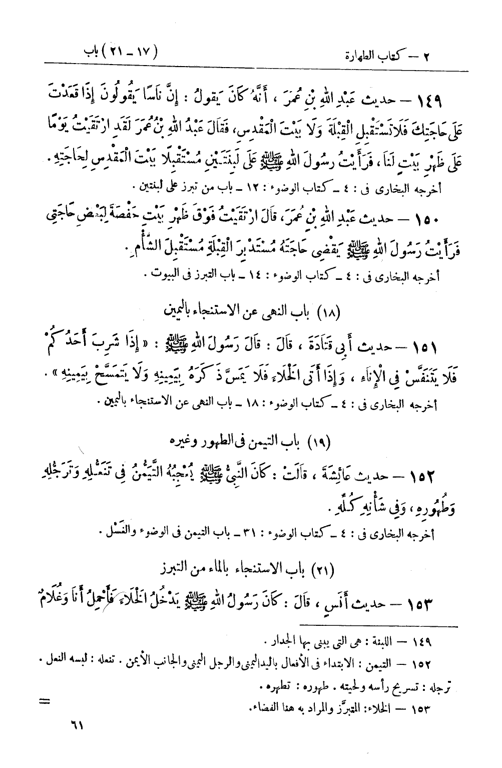 150 - حديث عَبْدِ اللهِ بْنِ عُمَرَ، قَالَ ارْتَقَيْتُ فَوْقَ ظَهْرِ بَيْتِ حَفْصَةَ لِبَعضِ حَاجَتِي فَرَأَيْتُ رَسُولَ اللهِ صَلَّى اللَّهُ عَلَيْهِ وَسَلَّمَ يَقْضِي حَاجَتَهُ مُسْتَدْبِرَ الْقِبْلَةِ مُسْتَقْبِلَ الشَّامِ