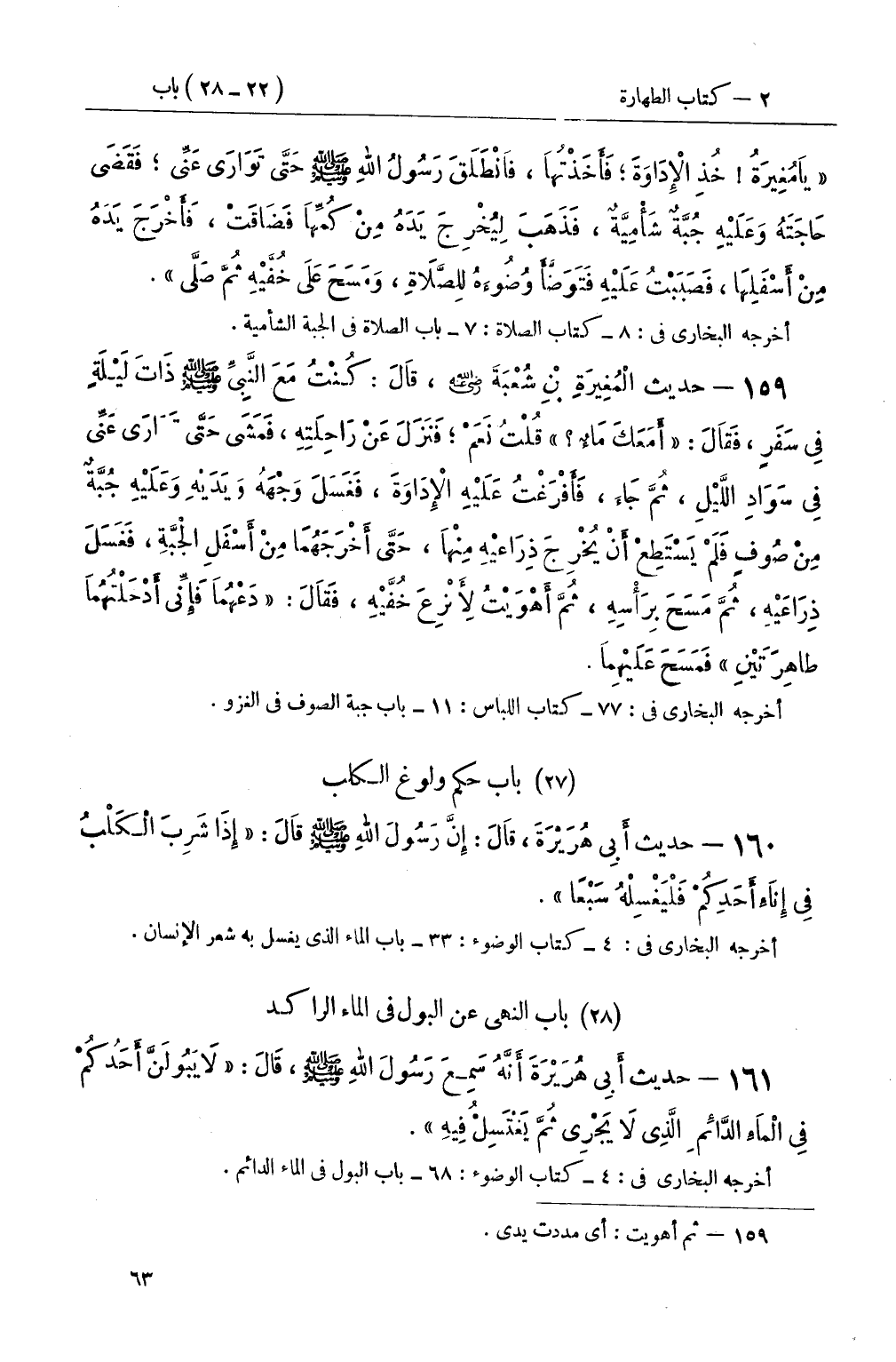 159 - حديث الْمُغِيرَةِ بْنِ شُعْبَةَ رضي الله عنه، قَالَ: كُنْتُ مَعَ النَّبِيِّ صَلَّى اللَّهُ عَلَيْهِ وَسَلَّمَ ذَاتَ لَيْلَةٍ فِي سَفَرٍ، فَقَالَ: أَمَعَكَ مَاءٌ قُلْتُ: نَعَمْ؛ فَنَزَلَ عَنْ رَاحِلَتِهِ، فَمَشَى حَتَّى تَوَارَى عَنِّي فِي سَوَادِ اللَّيْلِ، ثُمَّ جَاءَ، فَأَفْرَغْتُ عَلَيْهِ الإِدَاوَةَ، فَغَسَلَ وَجْهَهُ وَيَدَيْهِ وَعَلَيْهِ جُبَّةٌ مِنْ صُوفٍ فَلَمْ يَسْتَطِعْ أَنْ يُخْرِجَ ذِرَاعيْهِ مِنْهَا، حَتَّى أَخْرَجَهُمَا مِنْ أَسْفَلِ الْجبَّةِ، فَغَسَلَ ذِرَاعَيْهِ، ثُمَّ مَسَحَ بِرَأْسِهِ، ثُمَّ أَهْوَيْتُ لأَنْزِعَ خُفَّيْهِ، فَقَالَ: دَعْهُما فَإِنِّي أَدْخَلْتُهُمَا طاهِرَتَيْنِ فَمَسَحَ عَلَيْهِمَا