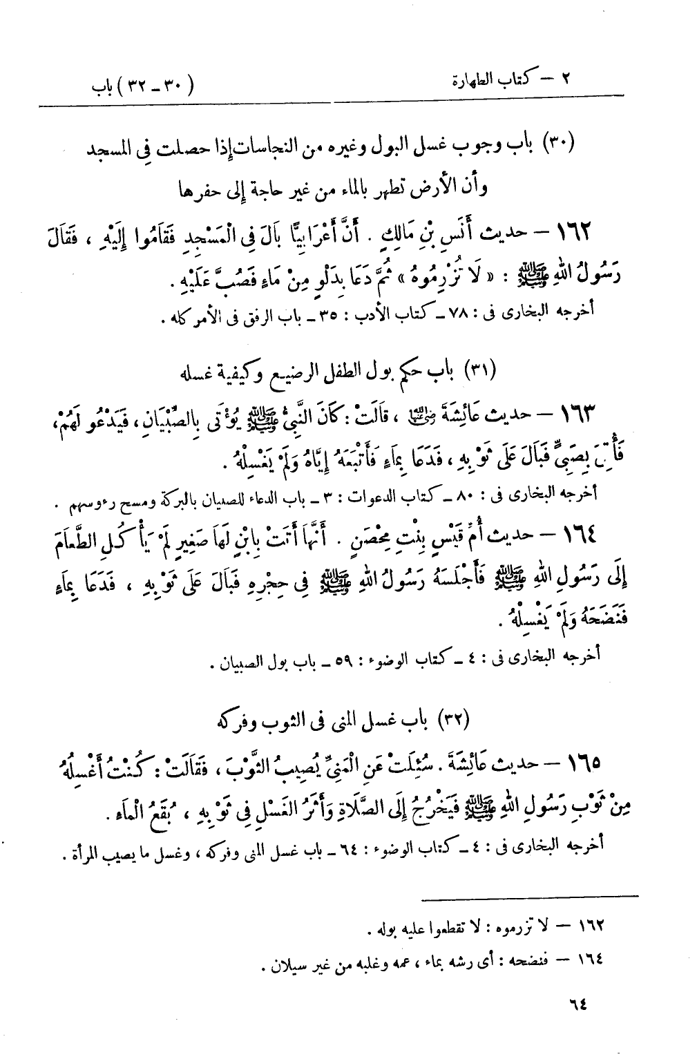 163 - حديث عَائِشَةَ، قَالَتْ: كَانَ النَّبِيُّ صَلَّى اللَّهُ عَلَيْهِ وَسَلَّمَ يُؤْتَى بِالصِّبْيَانِ، فَيَدْعُو لَهُمْ، فَأُتِيَ بِصَبِيٍّ فَبَالَ عَلَى ثَوْبِهِ، فَدَعَا بِمَاءٍ فَأَتْبَعَهُ إِيَّاهُ وَلَمْ يَغْسِلْهُ
