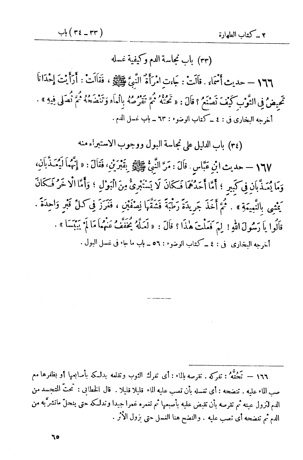 166 - حديث أَسْماءَ قَالَتْ: جَاءتِ امْرَأَةٌ النَّبِيَّ صَلَّى اللَّهُ عَلَيْهِ وَسَلَّمَ، فَقَالَتْ: أَرَأَيْتَ إِحْدَانَا تَحِيضُ فِي الثَّوْبِ كَيْفَ تَصْنَعُ قَالَ: تَحُتُّهُ ثُمَّ تَقْرُصُهُ بِالْمَاءِ وَتَنْضَحُهُ ثُمَّ تُصَلي فِيهِ