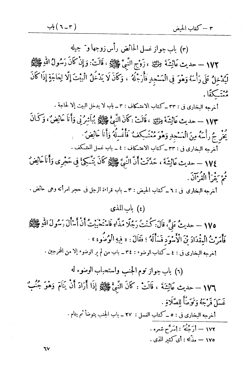 173 - حديث عَائِشَةَ، قَالَتْ: كَانَ النَّبِيُّ صَلَّى اللَّهُ عَلَيْهِ وَسَلَّمَ يُبَاشِرُنِي وَأَنَا حَائِضٌ، وَكَانَ يُخْرِجُ رَأْسَهُ مِنَ الْمَسْجِدِ وَهُوَ مُعْتَكِفٌ فَأَغْسِلُهُ وَأَنَا حَائِضٌ