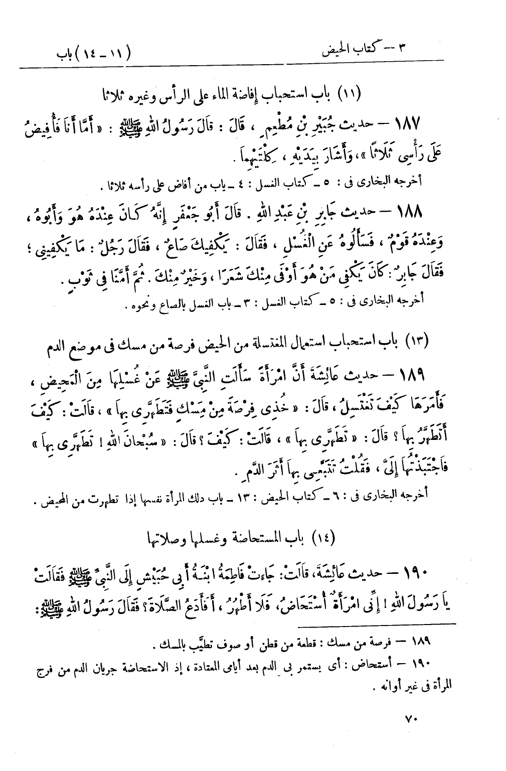 189 - حديث عَائِشَةَ أَنَّ امْرَأَةً سَأَلَتِ النَّبِيَّ صَلَّى اللَّهُ عَلَيْهِ وَسَلَّمَ عَنْ غُسْلِهَا مِنَ الْمَحِيضِ، فَأَمَرَهَا كَيْفَ تَغْتَسِلُ، قَالَ: خُذِي فِرْصَةَ مِنْ مِسْكٍ فَتَطَهَّرِي بِهَا، قَالَتْ: كَيْفَ أَتَطَهَّرُ بِهَا قَالَ: تَطَهَّرِي بِهَا، قَالَتْ: كَيْفَ قَالَ: سُبْحانَ اللهِ تَطَهَّرِي بِهَا فَاجْتَبَذْتُهَا إِلَيَّ، فَقُلْتُ تَتَبَعِي بِهَا أَثَرَ الدَّمِ
