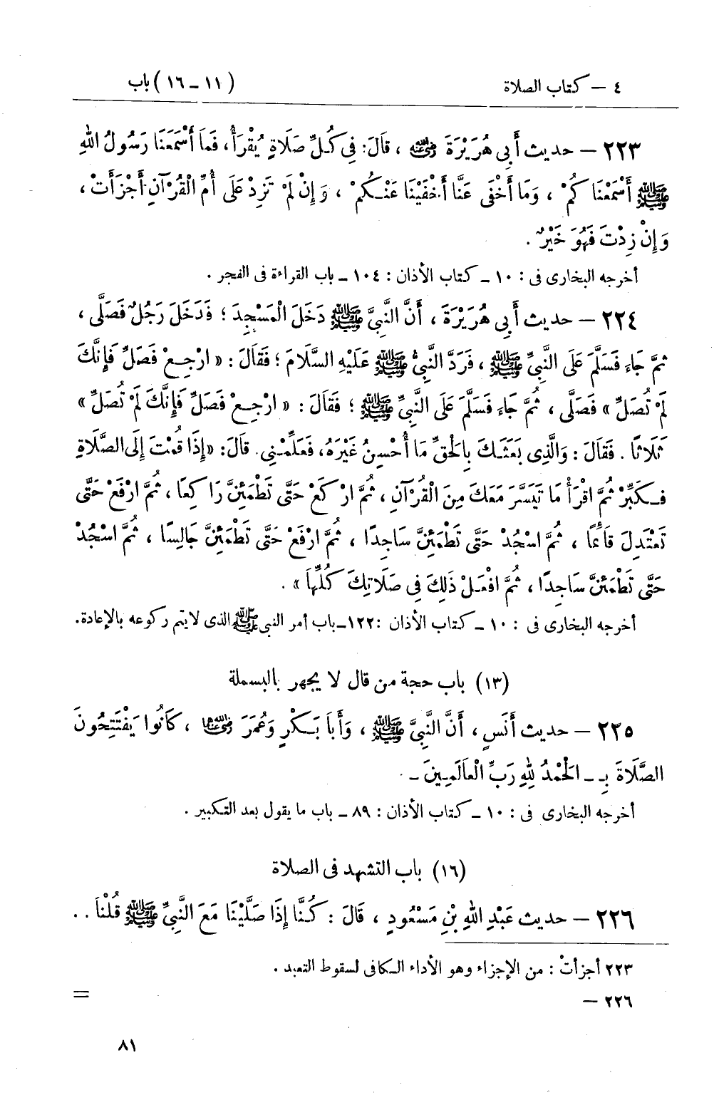 224 - حديث أَبِي هُرَيْرَةَ، أَنَّ النَّبِيَّ صَلَّى اللَّهُ عَلَيْهِ وَسَلَّمَ دَخَلَ الْمَسْجِدَ؛ فَدَخَلَ رَجُلٌ فَصَلَّى، ثُمَّ جَاءَ فَسَلَّمَ عَلَى النَبِيِّ صَلَّى اللَّهُ عَلَيْهِ وَسَلَّمَ، فَرَدَّ النَّبِيُّ صَلَّى اللَّهُ عَلَيْهِ وَسَلَّمَ عَلَيْهِ السَّلاَمَ؛ فَقَالَ: ارْجِعْ فَصَلِّ فَإِنَّكَ لَمْ تُصَلِّ فَصَلَّى، ثُمَّ جَاءَ فَسَلَّمَ عَلَى النَّبِيِّ صَلَّى اللَّهُ عَلَيْهِ وَسَلَّمَ؛ فَقَالَ: ارْجِعْ فَصَلِّ فَإِنَّكَ لَمْ تُصَلِّ ثَلاَثًا فَقَالَ: وَالَّذِي بَعَثَكَ بِالْحَقِّ مَا أُحْسِنُ غَيْرَهُ، فَعَلِّمْنِي قَالَ: إِذَا قُمْتَ إِلَى الصَّلاَةِ فكَبِّرْ ثُمَّ اقْرَأْ مَا تَيَسَّرَ مَعَكَ مِنَ الْقُرْآنِ، ثُمَّ ارْكَعْ حَتَّى تَطْمَئِنَّ رَاكِعًا، ثُمَّ ارْفَعْ حَتَّى تَعْتَدِلَ قَائِمًا، ثُمَّ اسْجُدْ حَتَّى تَطْمَئِنَّ سَاجِدًا، ثُمَّ ارْفَعْ حَتَّى تَطْمَئِنَّ جَالِسًا، ثُمَّ اسْجُدْ حَتَّى تَطْمَئنَّ سَاجِدًا، ثُمَّ افْعَلْ ذَلِكَ فِي صَلاَتِكَ كُلِّهَا