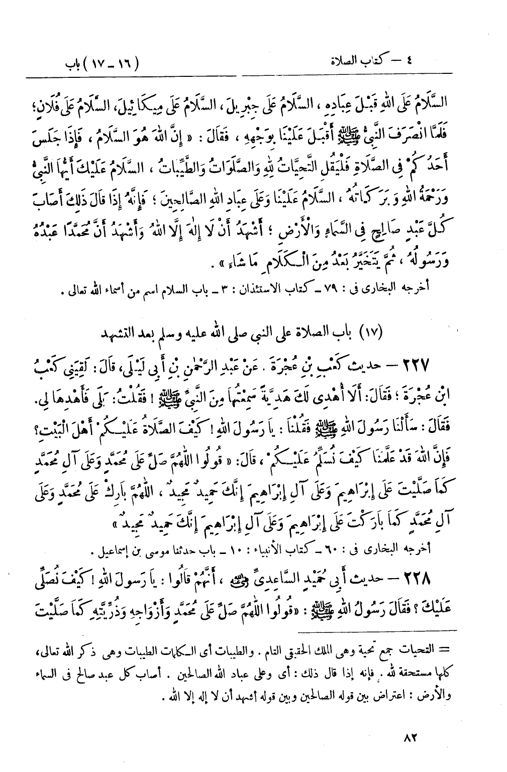 227 - حديث كَعْبِ بْنِ عُجْرَةَ عَنْ عَبْدِ الرَّحْمنِ ابْنِ أَبِي لَيْلَى، قَالَ: لَقِيَنِي كَعْبُ بْن عُجْرَةَ؛ فَقَالَ: أَلاَ أُهْدِي لَكَ هَدِيَّةً سَمِعْتُهَا مِنَ النَّبِيِّ صَلَّى اللَّهُ عَلَيْهِ وَسَلَّمَ فَقُلْتُ: بَلَى فَأَهْدِهَا لِي فَقَالَ: سَأَلْنَا رَسُولَ اللهِ صَلَّى اللَّهُ عَلَيْهِ وَسَلَّمَ فَقُلْنَا: يَا رَسُولَ اللهِ كَيْفَ الصَّلاَةُ عَلَيْكُمْ أَهْلَ الْبَيْتِ فَإِنَّ اللهَ قَدْ عَلَّمَنَا كَيْفَ نُسَلِّمُ عَلَيْكُمْ، قَالَ: قُولُوا اللهُمَّ صَلِّ عَلَى مُحَمَّدٍ وَعَلَى آلِ مُحَمَّدٍ كَمَا صَلَّيْتَ عَلَى إِبْرَاهِيمَ وَعَلَى آلِ إِبْرَاهِيمَ إِنَّكَ حَمِيدٌ مَجِيدٌ، اللهُمَّ بَارِكْ عَلى مُحَمَّدٍ وَعَلَى آلِ مُحَمَّدٍ كَمَا بَارَكْتَ عَلَى إِبْرَاهِيمَ وَعَلَى آلِ إِبْرَاهِيمَ إِنَّكَ حَمِيدٌ مَجِيدٌ