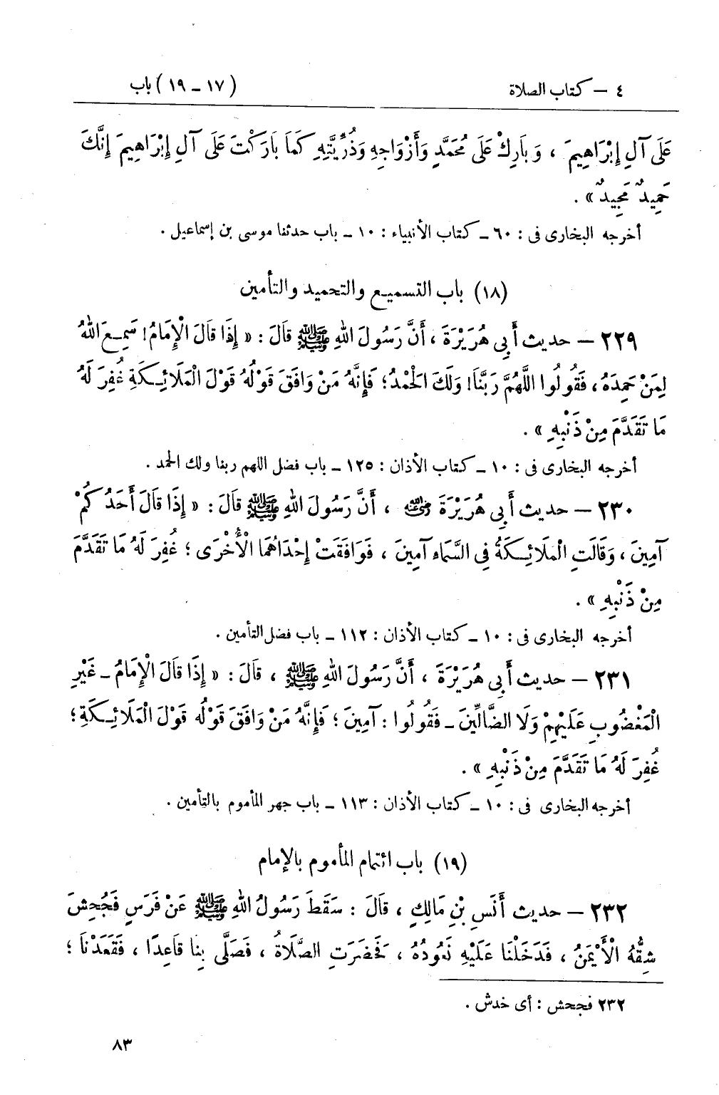 229 - حديث أَبِي هُرَيْرَةَ، أَنَّ رَسُولَ اللهِ صَلَّى اللَّهُ عَلَيْهِ وَسَلَّمَ قَالَ: إِذَا قَالَ الإِمَامُ سَمِعَ اللهُ لِمَنْ حَمِدَهُ، فَقُولُوا: اللهُمَّ رَبَّنَا وَلَكَ الْحَمْدُ؛ فَإِنَّهُ مَنْ وَافَقَ قَوْلُهُ قَوْلَ الْمَلاَئِكَةِ غُفِرَ لَهُ مَا تَقَدَّمَ مِنْ ذَنْبِهِ