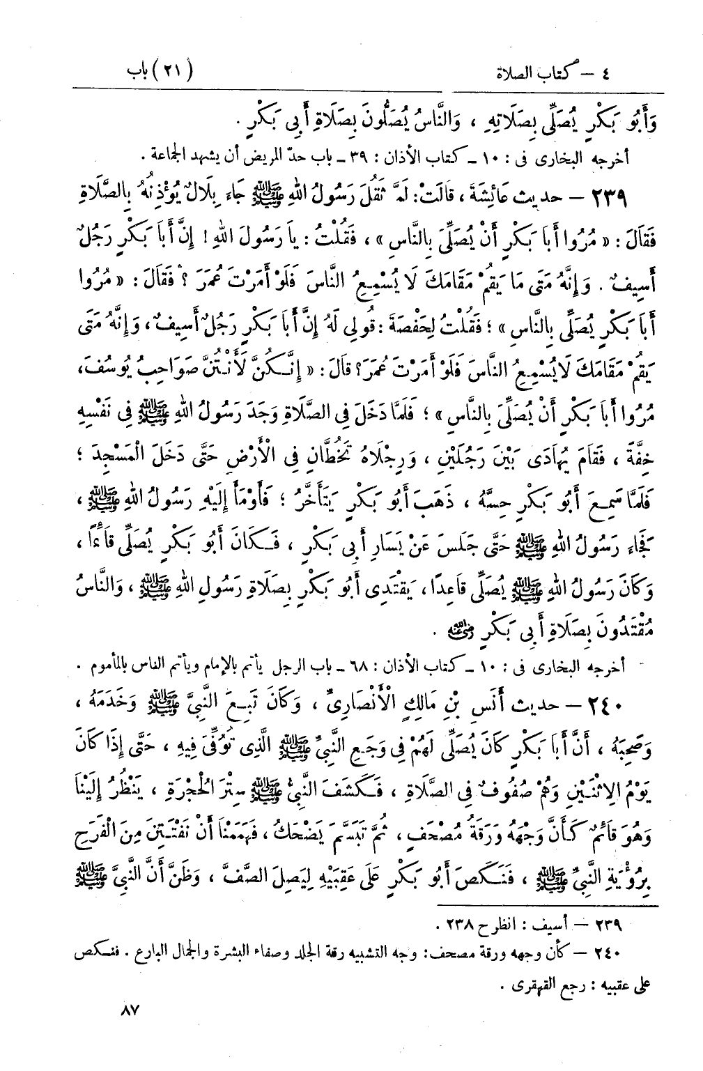 239 - حديث عَائِشَةَ، قَالَتْ: لَمَّا ثَقُلَ رَسُولُ اللهِ صَلَّى اللَّهُ عَلَيْهِ وَسَلَّمَ جَاءَ بِلاَلٌ يُؤْذِنُهُ بِالصَّلاَةِ فَقَالَ: مُرُوا أَبَا بَكْرٍ أَنْ يُصَلِّيَ بِالنَّاسِ، فَقُلْتُ: يَا رَسُولَ اللهِ إِنَّ أَبَا بَكْرٍ رَجُلٌ أَسِيفٌ وَإِنَّهُ مَتَى مَا يَقُمْ مَقَامَكَ لاَ يُسْمِعُ النَّاسَ فَلَوْ أَمَرْتَ عُمَرَ فَقَالَ: مُرُوا أَبَا بَكْرٍ يُصَلِّي بِالنَّاسِ؛ فَقُلْتُ لِحَفْصَةَ: قُولِي لَهُ إِنَّ أَبَا بَكْرٍ رَجُلٌ أَسِيفٌ، وَإِنَّهُ مَتَى يَقُمْ مَقَامَكَ لاَ يُسْمِعُ النَّاسَ فَلَوْ أَمَرْتَ عُمَرَ قَالَ: إِنَّكُنَّ لأَنْتُنَّ صَوَاحِبُ يُوسُفَ، مُرُوا أَبَا بَكْرٍ أَنْ يُصَلِّيَ بِالنَّاس؛ فَلَمَّا دَخَلَ فِي الصَّلاَةِ وَجَدَ رَسُولُ اللهِ صَلَّى اللَّهُ عَلَيْهِ وَسَلَّمَ فِي نَفْسِهِ خِفَّةً، فَقَامَ يُهَادَى بَيْنَ رَجُلَيْنِ، وَرِجْلاَهُ تَخُطَّانِ فِي الأَرْضِ حَتَّى دَخَلَ الْمَسْجِدَ؛ فَلَمَّا سَمِعَ أَبُو بَكْرٍ حِسَّهُ، ذَهَبَ أَبُو بَكْرٍ يَتَأَخَّرُ؛ فَأَوْمَأَ إِلَيْهِ رَسُولُ اللهِ صَلَّى اللَّهُ عَلَيْهِ وَسَلَّمَ، فَجَاءَ رَسُولُ اللهِ صَلَّى اللَّهُ عَلَيْهِ وَسَلَّمَ حَتَّى جَلَسَ عَنْ يَسَارٍ أَبِي بَكْرٍ، فَكَانَ أَبُو بَكْرٍ يُصَلِّي قَائِمًا، وَكَانَ رَسُولُ اللهِ صَلَّى اللَّهُ عَلَيْهِ وَسَلَّمَ يُصَلِّي قَاعِدًا، يَقْتَدِي أَبُو بَكْرٍ بِصَلاَةِ رَسُولِ اللهِ صَلَّى اللَّهُ عَلَيْهِ وَسَلَّمَ، وَالنَّاسُ مُقْتَدُونَ بِصَلاَةِ أَبِي بَكْرٍ رضي الله عنه