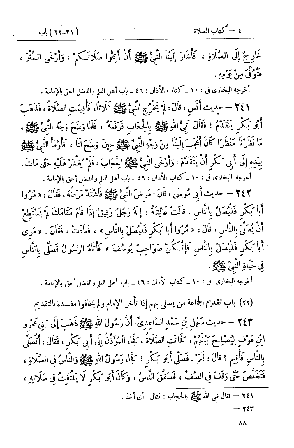 241 - حديث أَنَسٍ، قَالَ: لَمْ يَخْرُجِ النَّبِيُّ صَلَّى اللَّهُ عَلَيْهِ وَسَلَّمَ ثَلاَثًا، فَأُقِيمَتِ الصَّلاَةُ، فَذَهَبَ أَبُو بَكْرٍ يَتَقَدَّمُ؛ فَقَالَ نَبِيُّ اللهِ صَلَّى اللَّهُ عَلَيْهِ وَسَلَّمَ بِالْحِجَابِ فَرَفَعَهُ، فَلَمَّا وَضَحَ وَجْهُ النَّبِيِّ صَلَّى اللَّهُ عَلَيْهِ وَسَلَّمَ، مَا نَظَرْنَا مَنْظَرًا كَانَ أَعْجَبَ إِلَيْنَا مِنْ وَجْهِ النَّبِيِّ صَلَّى اللَّهُ عَلَيْهِ وَسَلَّمَ حِينَ وَضَحَ لَنَا، فَأَوْمَأَ النَّبِيُّ صَلَّى اللَّهُ عَلَيْهِ وَسَلَّمَ بِيَدِهِ إِلَى أَبِي بَكْرٍ أَنْ يَتَقَدَّمَ، وَأَرْخَى النَّبِيُّ صَلَّى اللَّهُ عَلَيْهِ وَسَلَّمَ الْحِجَابَ، فَلَمْ يُقْدَرْ عَلَيْهِ حَتَّى مَاتَ