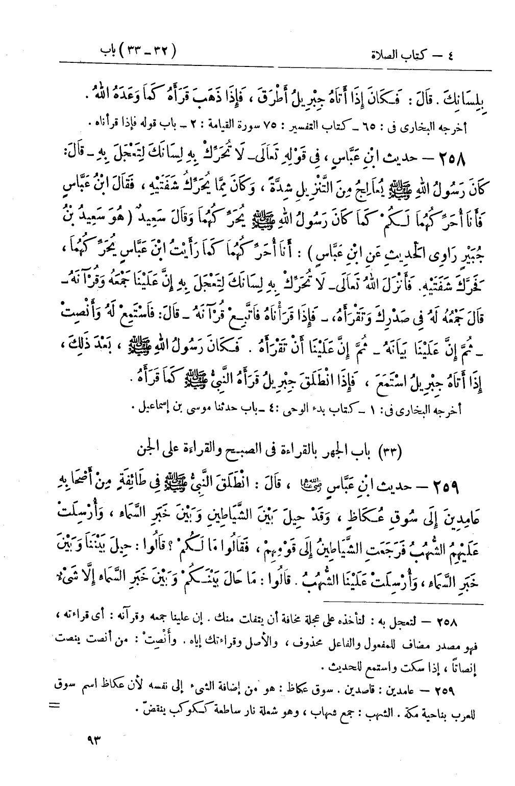 259 - حديث ابْنِ عَبَّاسٍ، قَالَ: انْطَلَقَ النَّبِيُّ صَلَّى اللَّهُ عَلَيْهِ وَسَلَّمَ فِي طَائِفَةٍ مِنْ أَصْحَابِهِ عَامِدِينَ إِلَى سُوقِ عُكَاظٍ، وَقَدْ حِيلَ بَيْنَ الشَّيَاطِينِ وَبَيْنَ خَبَرِ السَّمَاءِ، وَأُرْسِلَتْ عَلَيْهِمُ الشُّهُبُ فَرَجَعَتِ الشَّيَاطِينُ إِلَى قَوْمِهِمْ، فَقَالُوا مَا لَكُمْ قَالُوا: حِيلَ بَيْنَنَا وَبَيْنَ خَبَرِ السَّمَاءِ، وَأُرْسِلَتْ عَلَيْنَا الشُّهُبُ قَالُوا: مَا حَالَ بَيْنَكُمْ وَبَيْنَ خَبَرِ السَّمَاءِ إِلاَّ شَيْءٌ -[94]- حَدَثَ، فَاضْرِبُوا مَشَارِقَ الأَرْضِ وَمَغَارِبَهَا فَانْظُرُوا مَا هذَا الَّذِي حَالَ بَيْنَكُمْ وَبَيْنَ خَبَرِ السَّمَاءِ فَانْصَرَفَ أُولئِكَ الَّذِينَ تَوَجَّهُوا نَحْوَ تِهَامَةَ إِلَى النَّبِيِّ صَلَّى اللَّهُ عَلَيْهِ وَسَلَّمَ، وَهُوَ بِنَخْلَةَ عَامِدِينَ إِلَى سُوقِ عُكَاظٍ، وَهُوَ يُصَلِّي بِأَصْحَابِهِ صَلاَةَ الْفَجْرِ، فَلَمَّا سَمِعُوا الْقُرْآنَ اسْتَمَعُوا لَهُ؛ فَقَالُوا: هذَا وَاللهِ الَّذِي حَالَ بَيْنَكُمْ وَبَيْنَ خَبَرِ السَّمَاءِ، فَهُنَالِكَ حِينَ رَجَعُوا إِلَى قَوْمِهِمْ؛ فَقَالُوا: (يَا قوْمَنَا إِنَّا سَمِعْنَا قُرْآنًا عَجَبًا يَهْدِي إلى الرُّشْدِ فَآمَنَّا بِهِ وَلَنْ نُشْرِكَ بِرَبِّنَا أَحَدًا) فَأَنْزَلَ اللهُ عَلَى نَبِيِّهِ صَلَّى اللَّهُ عَلَيْهِ وَسَلَّمَ (قُلْ أُوحِيَ إِلَيَّ أَنَّهُ اسْتَمَعَ نَفَرٌ مِنَ الْجِنِّ) وَإِنِّمَا أُوحِيَ إِلَيْهِ قَوْلُ الْجِنِّ