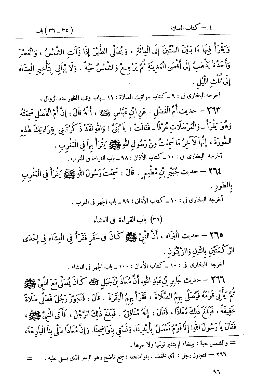 266 - حديث جَابِرِ بْنِ عَبْدِ اللهِ، أَنَّ مُعَاذَ بْنَ جَبَلٍ رضي الله عنه كَانَ يُصَلِّي مَعَ النَّبِيِّ صَلَّى اللَّهُ عَلَيْهِ وَسَلَّمَ ثُمَّ يَأْتِي قَوْمَهُ فَيُصَلِّي بِهِمْ الصَّلاَةَ، فَقَرَأَ بِهِمُ الْبَقَرَةَ قَالَ: فَتَجَوَّزَ رَجُلٌ فَصَلَّى صَلاَةً خَفِيفَةً، فَبَلَغَ ذَلِكَ مُعَاذًا، فَقَالَ: إِنَّهُ مُنَافِقٌ فَبَلَغَ ذلِكَ الرَّجُلَ، فَأَتَى النَّبِيَّ صَلَّى اللَّهُ عَلَيْهِ وَسَلَّمَ، فَقَالَ يَا رَسُولَ اللهِ إِنَّا قَوْمٌ نَعْمَلُ بِأَيْدِينَا، وَنَسْقِي بِنَوَاضِحِنَا وَإِنَّ مُعَاذًا صَلَّى بِنَا الْبَارِحَةَ، -[97]- فَقَرَأَ الْبَقَرَةَ، فَتَجَوَّزْتُ، فَزَعَمْ أَنِّي مُنَافِقٌ فَقَالَ النَبِيُّ صَلَّى اللَّهُ عَلَيْهِ وَسَلَّمَ: يَا مُعَاذُ أَفَتَّانٌ أَنْتَ ثلاثًا اقْرَأْ (وَالشَّمْسِ وَضُحَاهَا) وَ (سَبِّحِ اسْمَ رَبِّكَ الأَعْلَى) وَنَحْوَهَا
