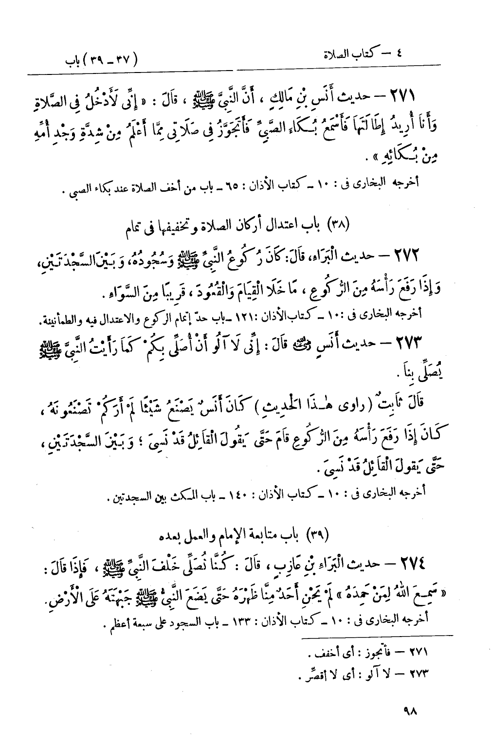 272 - حديث الْبَرَاءِ، قَالَ: كَانَ رُكُوعُ النَّبِيِّ صَلَّى اللَّهُ عَلَيْهِ وَسَلَّمَ وَسُجُودُهُ، وَبَيْنَ السَّجْدَتَيْنِ، وَإِذَا رَفَعَ رَأْسَهُ مِنَ الرُّكُوعِ، مَا خَلاَ الْقِيَامَ وَالقُعُودَ، قَرِيبًا مِنَ السَّوَاءِ