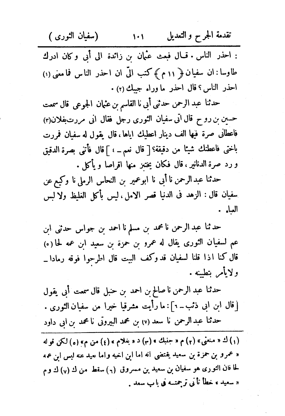 حَدثنا عَبد الرَّحمن حدثني أَبي، حَدثنا القاسم بن عثمان الجوعي، قال: سَمِعتُ حسين بن روح قال أتى سُفيان الثَّوري رجل فقال: إِنّي مررت بفلان فأَعطاني صرة فيها ألف دينار أعطيك إياها، قال يقول له سُفيان فمررت بأختي فأعطتك شيئًا من دقيقة؟ قَال نعم قال فأتني بصرة الدقيق ورد صرة الدنانير، قال فكان يختبز منها أقراصا ويأكل.