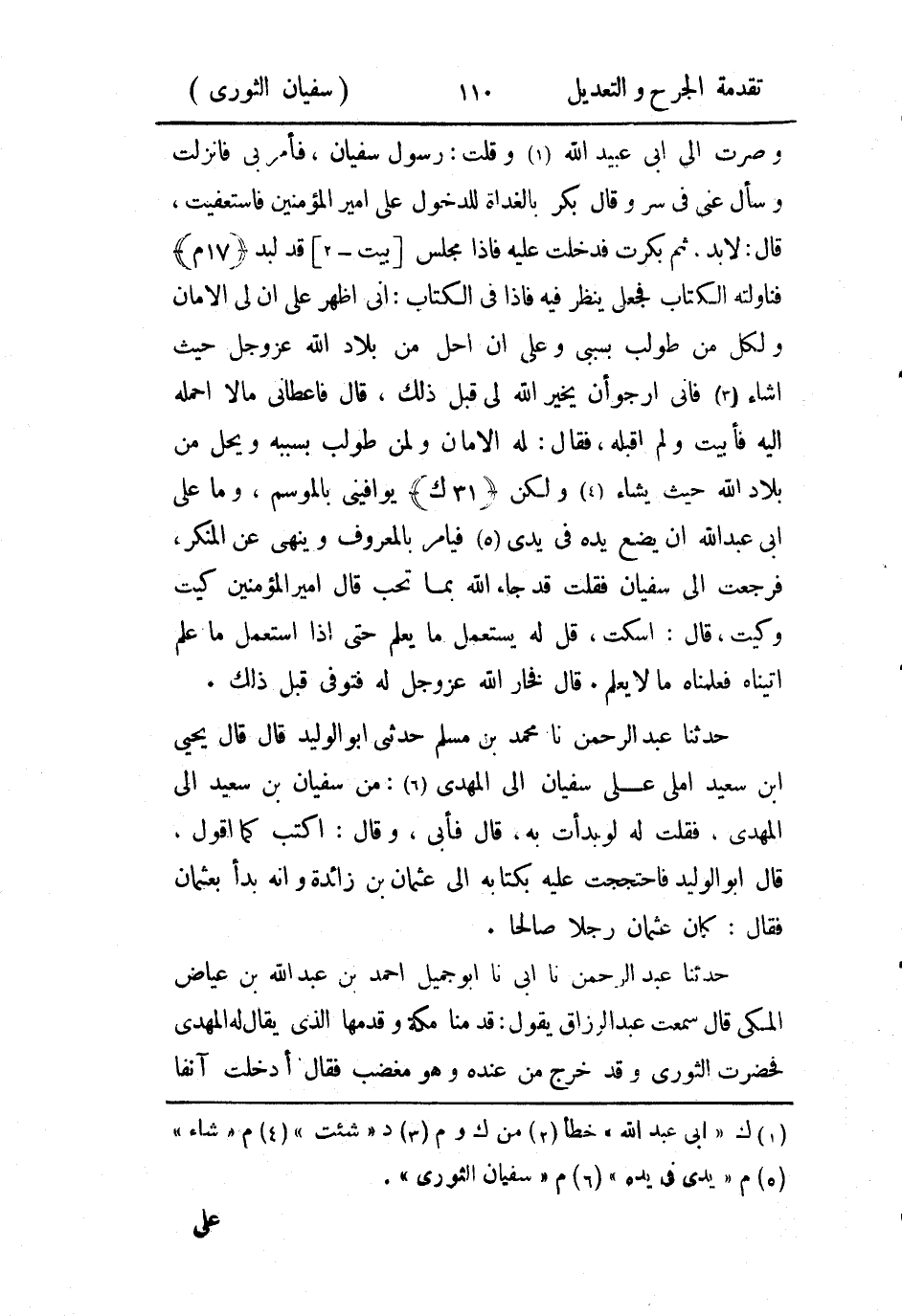 حَدثنا عَبد الرَّحمن، حَدثنا محمد بن مسلم حدثني أَبو الوليد قال: قال يَحيَى بن سَعيد أملي على سُفيان إلى المهدي: من سُفيان بن سَعيد إلى المهدي، فقلتُ له: لو بدأت به، قال فأبى، وقال: أكتب كما أَقول، قال أَبو الوليد فاحتججت عليه بكتابه إلى عثمان بن زائدة وإنه بدأ بعثمان فقال: كان عثمان رجلاً صالحا.
