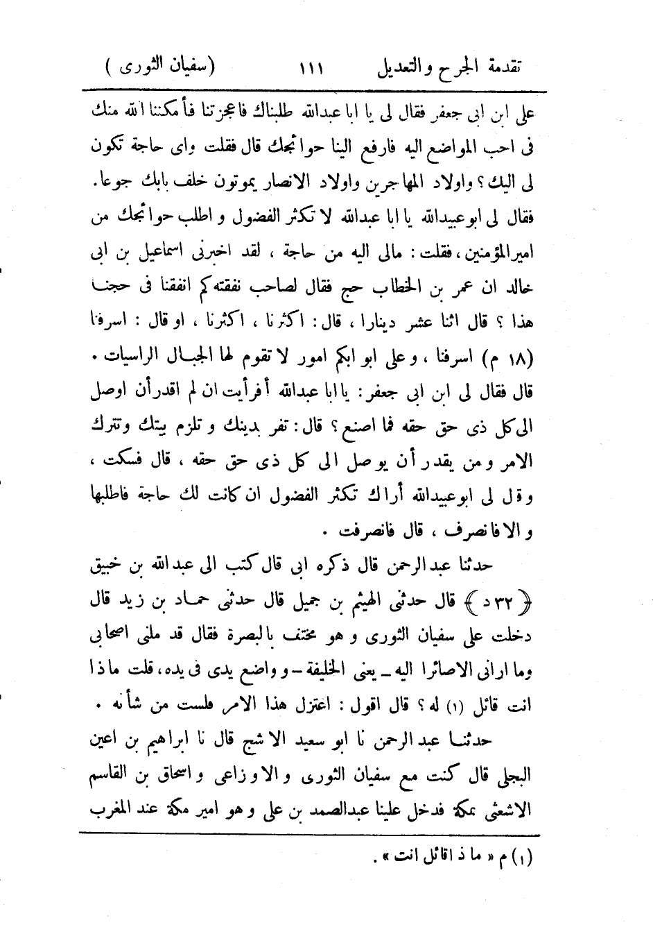 حَدثنا عَبد الرَّحمن، قال: ذكره أبي قال كتب إلي عَبد الله بن خبيق، قال: حَدثني الهيثم بن جميل، قال: حَدثني حماد بن زيد، قَال: دخلتُ على سُفيان الثَّوري، وهو مختف بالبصرة فقال قد ملني أَصحابي وما أراني إِلاَّ صائرا إِليه، يَعني الخليفة، وواضع يدي في يده، قلت ماذا أَنت قائل له؟ قال أَقول: إعتزل هذا الأمر فلست من شأنه.