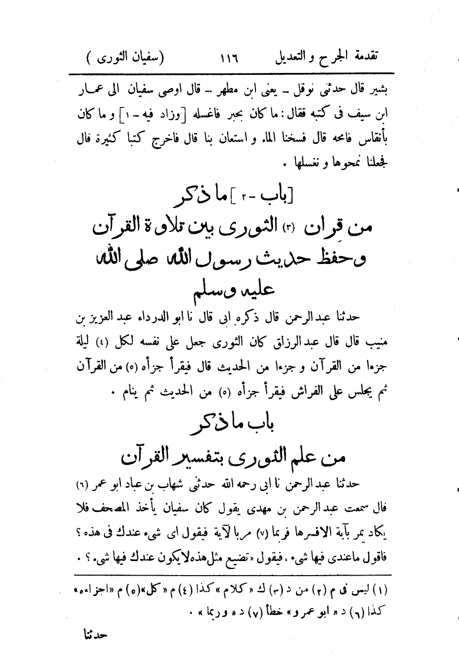 - باب ما ذكر من قران الثَّوري بين تلاوة القرآن وحفظ حديث رسول الله صَلى الله عَليه وسَلم.