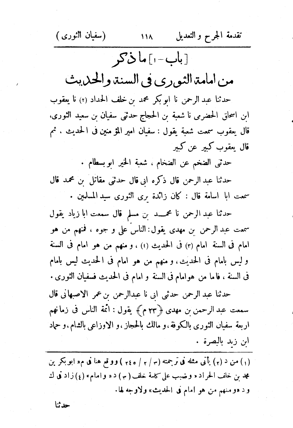 حَدثنا عَبد الرَّحمن، حَدثنا محمد بن مسلم، قال: سَمِعتُ أبَا زياد يقول: سَمِعتُ عَبد الرَّحمن بن مهدي يقول: الناس على وجوه، فمنهم من هو إمام في السنة إمام في الحديث، ومنهم من هو إمام في السنة وليس بإمام في الحديث، ومنهم من هو إمام في الحديث ليس بإمام في السنة، فأما من هو إمام في السنة وإمام في الحديث فسفيان الثَّوري.