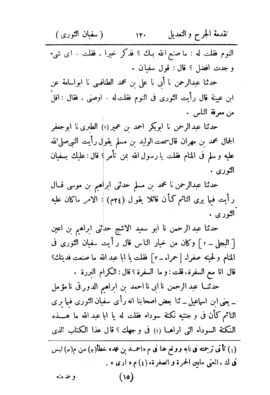 حَدثنا عَبد الرَّحمن، حَدثنا أَبي، حَدثنا أَحمد بن إِبراهيم الدورقي، حَدثنا مُؤَمَّل، يَعني ابن إِسماعيل، حَدثنا بعض أَصحابنا أَنه رأى سُفيان الثَّوري فيما يرى النائم كأن في وجنتيه نكتة سوداء فقلتُ له: يا أَبَا عَبد الله ما هذه النكتة السوداء التي أراها في وجهك؟ قال هذا الكتاب الذي وضعته للناس.
