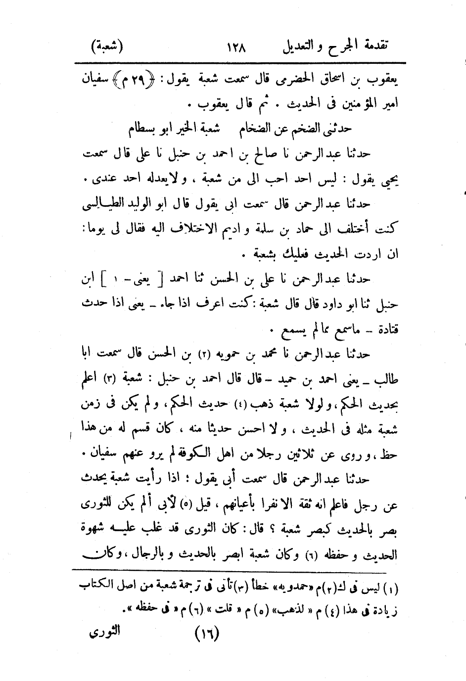حَدثنا عَبد الرَّحمن، قال: سَمِعتُ أَبي يقول: إِذا رأَيت شُعبة يحدث عن رجل، فاعلم أَنه ثقة إِلاَّ نفرا بأعيانهم، قيل لأَبي: ألَم يكن للثوري بصر بالحديث كبصر شُعبة؟ قال: كان الثَّوري قد غلب عليه شهوة الحديث وحفظه، وكان شُعبة أبصر بالحديث وبالرجال، وكان الثَّوري أَحفظ، وكان شُعبة بصيرا بالحديث جدا فهما له كأَنه خلق لهذا الشأن.
