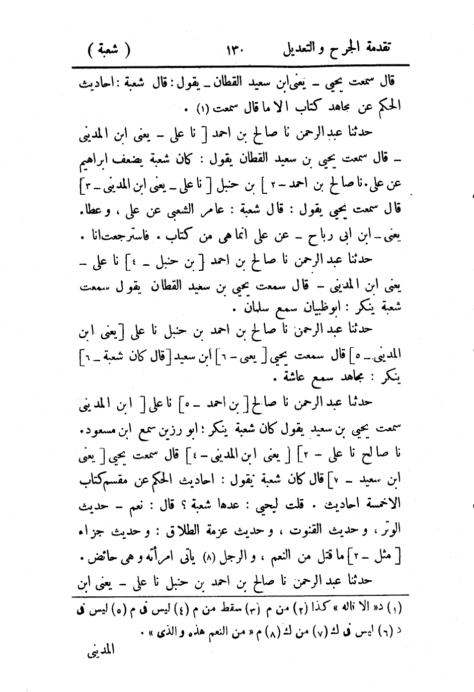 حَدثنا عَبد الرَّحمن، حَدثنا صالح بن أَحمد بن حَنبل، حَدثنا علي، يَعني ابن المَديني، قال: سَمِعتُ يحيى، يَعني ابن سَعيد قَال كان شُعبة ينكر: مجاهد سمع عاشة.