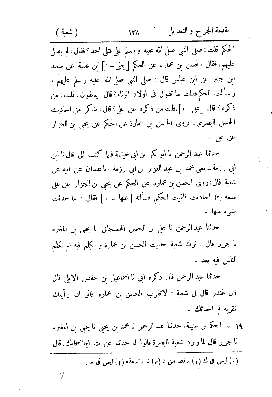 حَدثنا عَبد الرَّحمن، حَدثنا محمد بن يحيى، حَدثنا يَحيَى بن المغيرة، حَدثنا جرير قال: لما ورد شُعبة البصرة قالوا له: حَدثنا عن ثقات أَصحابك، قال: إِن حدثتكم عن ثقات أَصحابي فإِنَّمَا أحدثكم عن نفير يسير من هذه الشيعة، الحكم بن عُتَيبة، وسلمة بن كهيل، وحبيب بن أَبي ثابت، ومنصور.