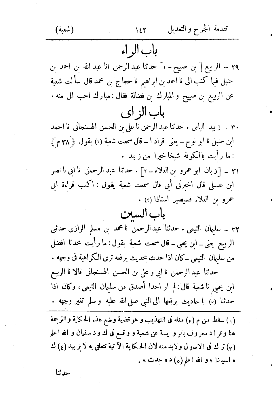 حَدثنا عَبد الرَّحمن، حَدثنا علي بن الحسن الهِسِنجَاني، حَدثنا أَحمد بن حَنبل، حَدثنا أَبو نوح، يَعني قرادا، قال: سَمِعتُ شُعبة يقول: ما رأَيت بالكوفة شيخا خيرًا من زبيد.