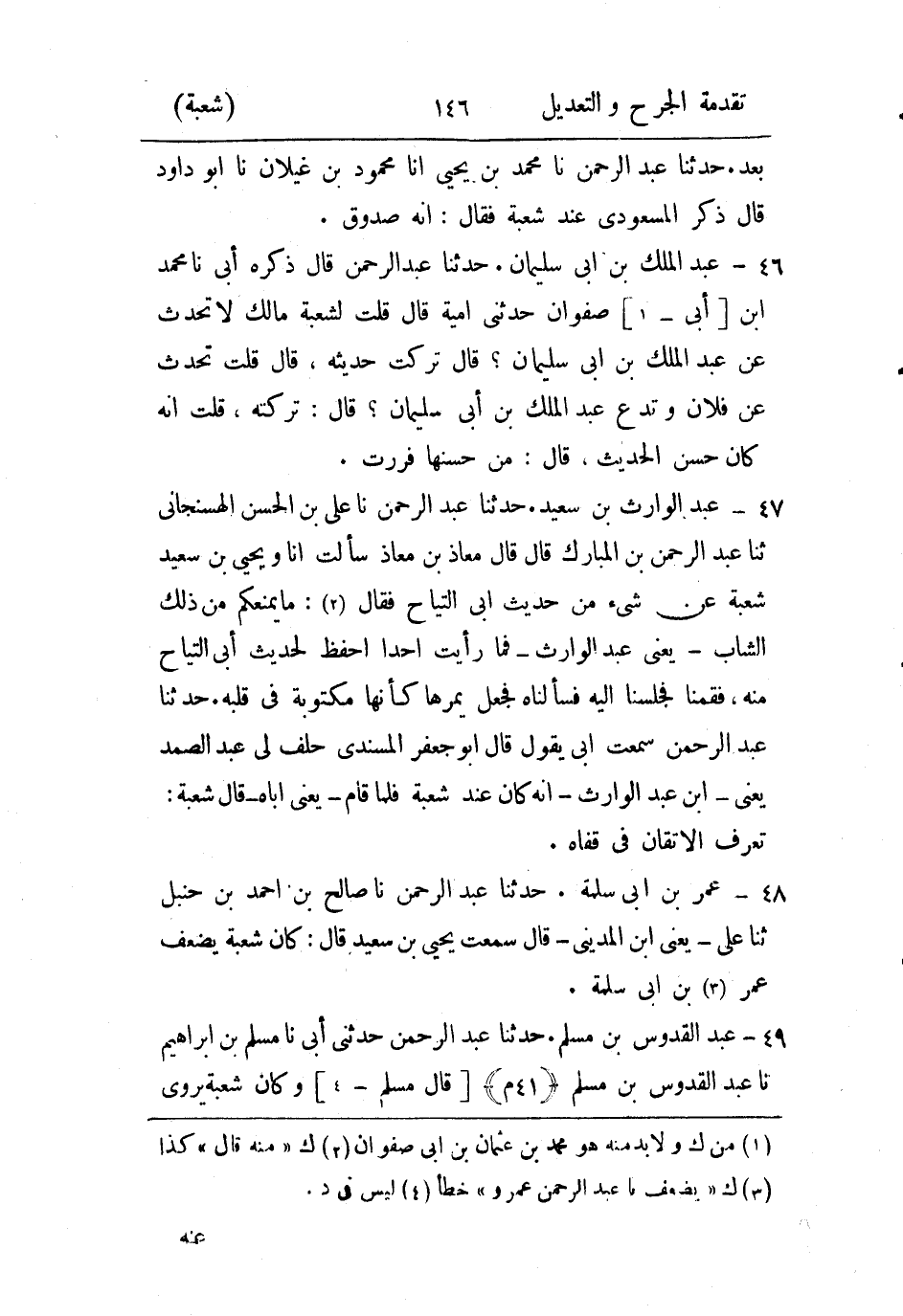 حَدثنا عَبد الرَّحمن حدثني أَبي، حَدثنا مسلم بن إِبراهيم، حَدثنا عَبد القدوس بن مسلم، قال مسلم وكان شُعبة يروي عنه ويثبته ودلنا عليه.