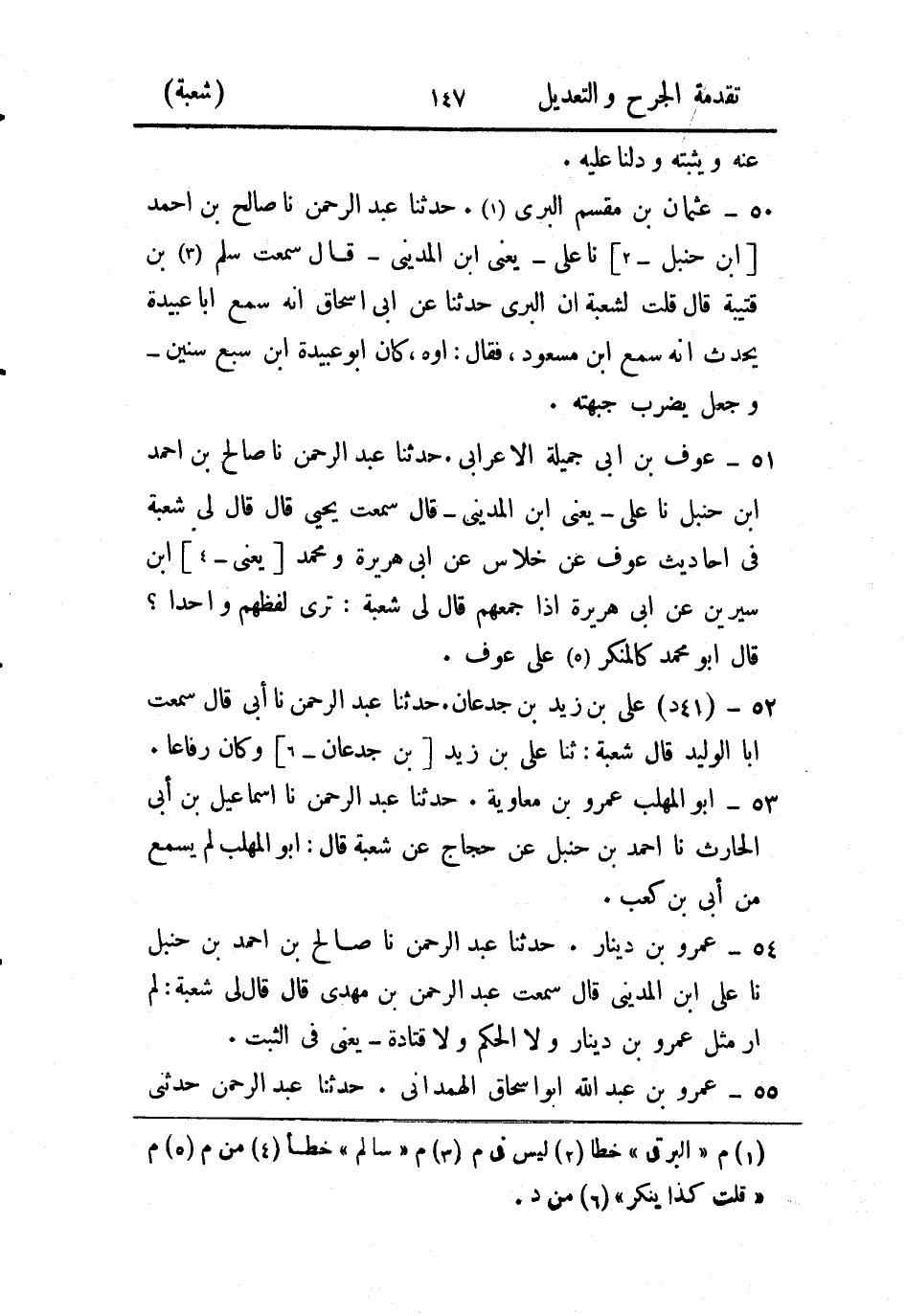 حَدثنا عَبد الرَّحمن، حَدثنا صالح بن أَحمد بن حَنبل، حَدثنا علي، يَعني ابن المَديني، قال: سَمِعتُ سَلْم بن قُتَيبة، قال: قلتُ لشُعبة إِن البري حَدثنا، عَن أَبي إِسحاق أنه سَمِعَ أَبَا عبيدة يحدث أَنه سمع ابن مسعود، فقال: أوه، كان أَبو عبيدة ابن سبع سنين، وجعل يضرب جبهته.