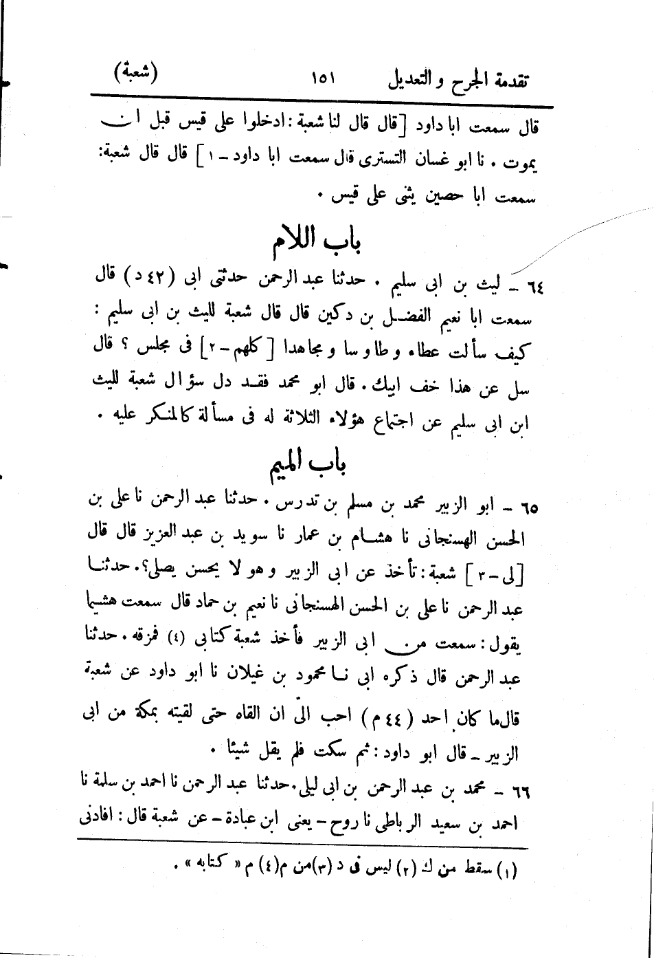 حَدثنا عَبد الرَّحمن، حَدثنا علي بن الحسن الهِسِنجَاني، حَدثنا نُعَيم بن حماد، قال: سَمِعتُ هُشَيمَا يقول: سمعت من أبي الزبير فأخذ شُعبة كتابي فمزقه.
