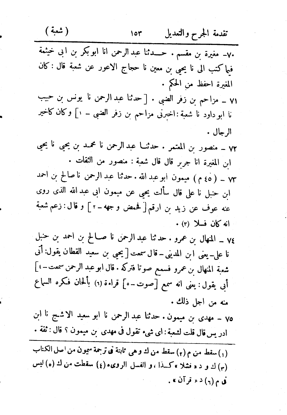 حَدثنا عَبد الرَّحمن، حَدثنا صالح بن أَحمد بن حَنبل، حَدثنا علي، يَعني ابن المَديني، قال: سَمِعتُ يَحيي بن سَعيد القطان يقول: أتى شُعبة المنهال بن عَمرو فسمع صوتا فتركه.