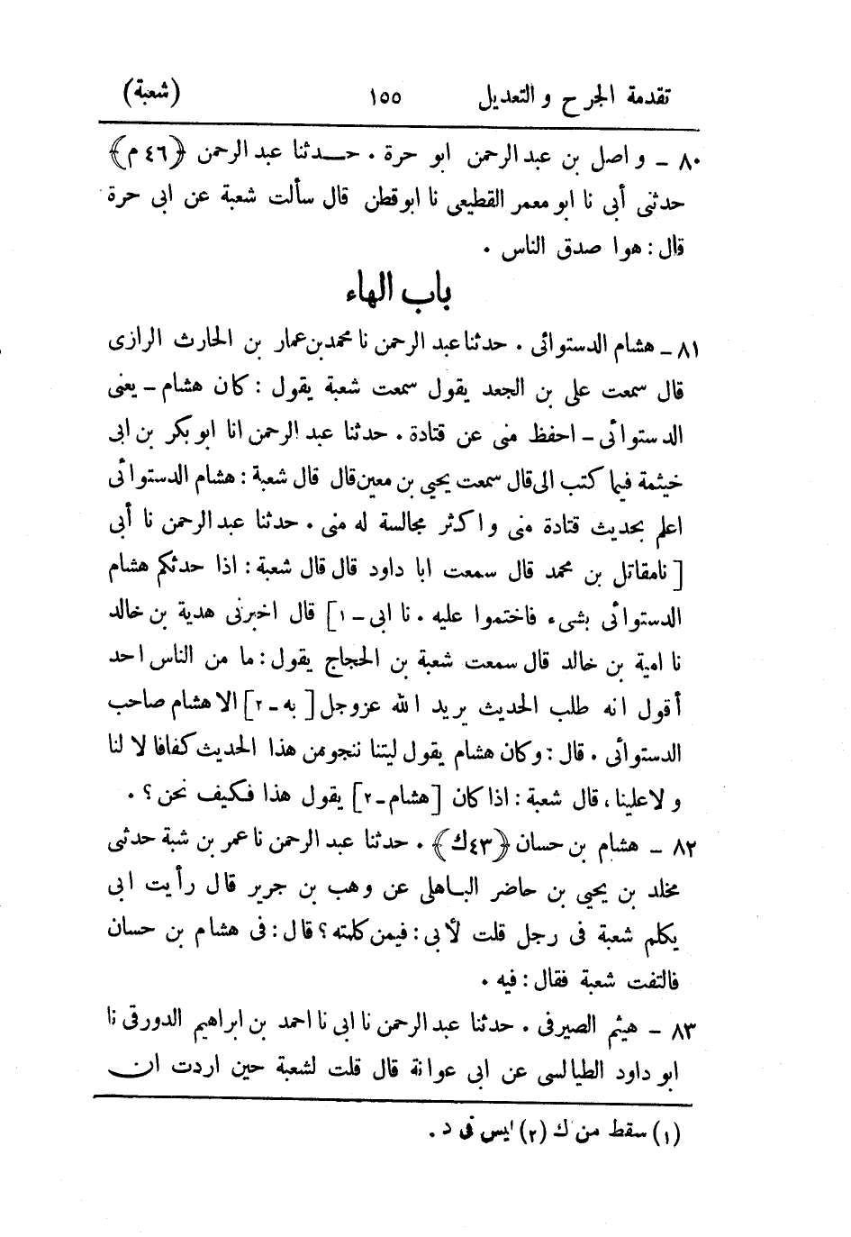 حَدثنا أبي قال أَخْبَرني هدية بن خالد، حَدثنا أُمية بن خالد، قال: سَمِعتُ شُعبة بن الحجاج يقول: ما من الناس أحد أَقول أَنه طلب الحديث يريد الله عز وجل به إِلاَّ هشام صاحب الدَّسْتُوائي.