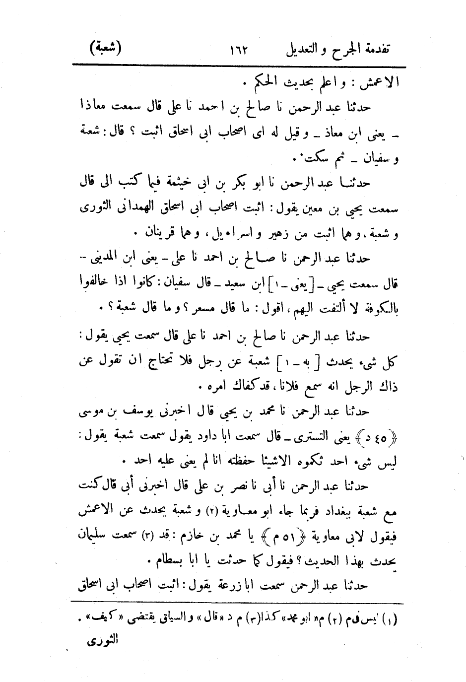 حَدثنا عَبد الرَّحمن، حَدثنا أَبي، حَدثنا نصر بن علي قال أَخْبَرني أبي قال كنت مع شُعبة ببغداد فربما جاء أَبو معاوية، وشُعبة يحدث عن الأَعمش فيقول لأَبي معاوية يا محمد بن خازم: قد سمعت سليمان يحدث بهذا الحديث؟ فيقول كما حدثت يا أَبَا بسطام.