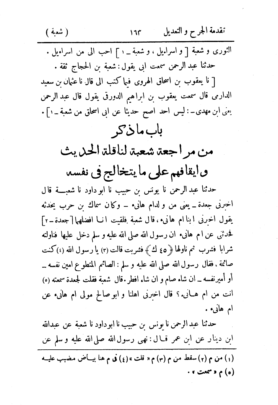 - باب ما ذكر من مراجعة شُعبة لناقلة الحديث وإيقافهم على ما يتخالج في نفسه.
